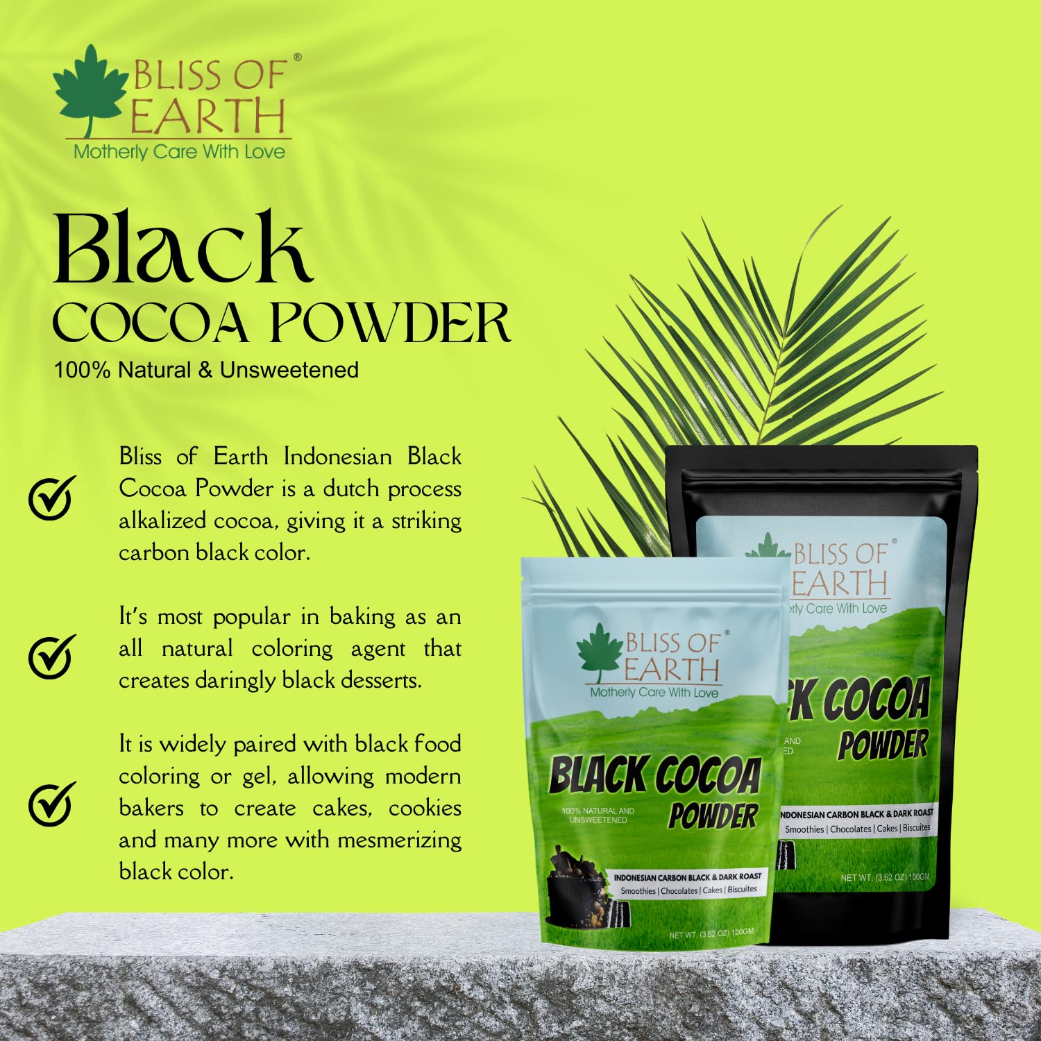 Bliss of Earth Indonesian Black Cocoa Powder is a dutch process alkalized cocoa giving it a striking carbon black color. It's most popular in baking as an all natural coloring agent that creates daringly black dessert. It is widely paired with black food coloring or gel allowing modern bakers to create cakes cookies and many more with mesmerizing black color. It also packs intense chocolate flavor without bringing any bitterness allowing you to intensify the taste of your chocolate baked goods with rich and deep chocolate flavor.