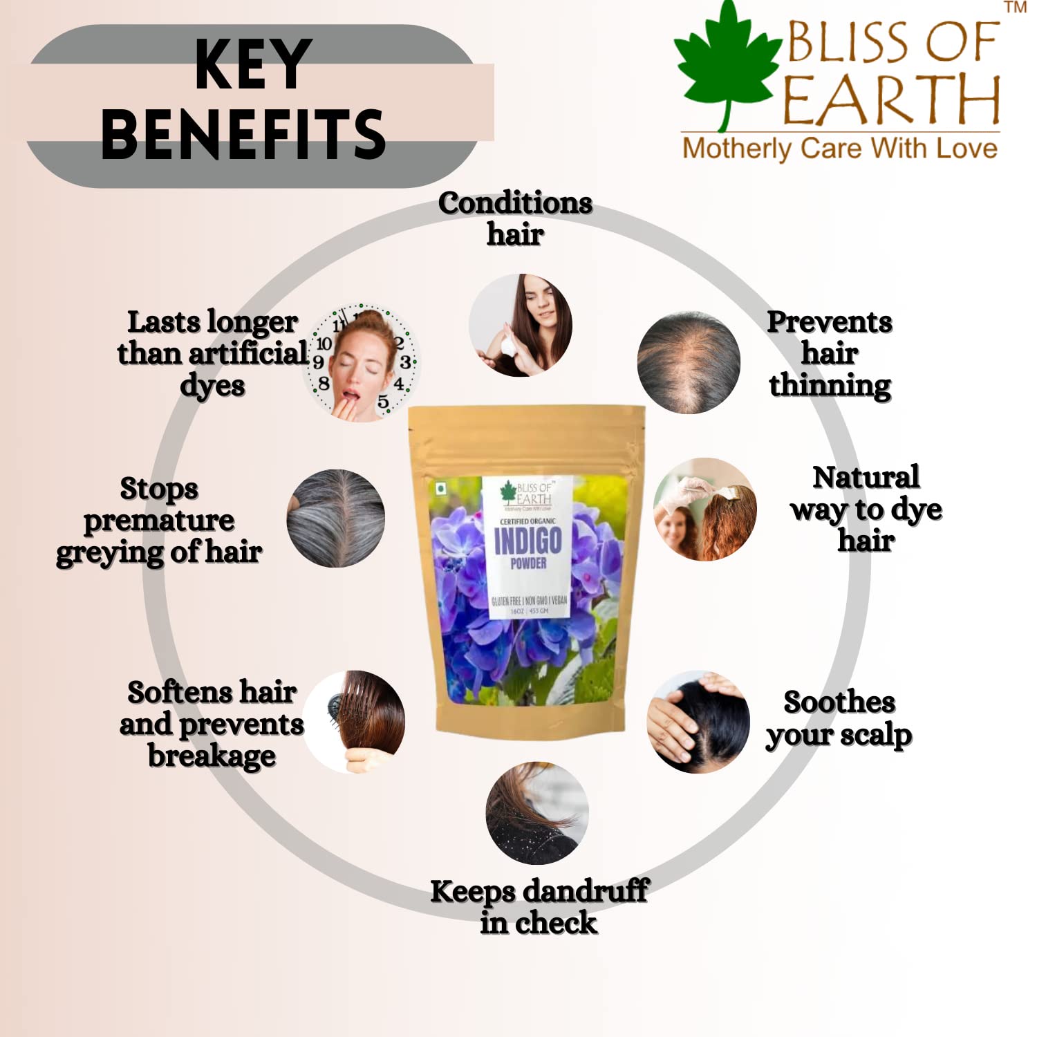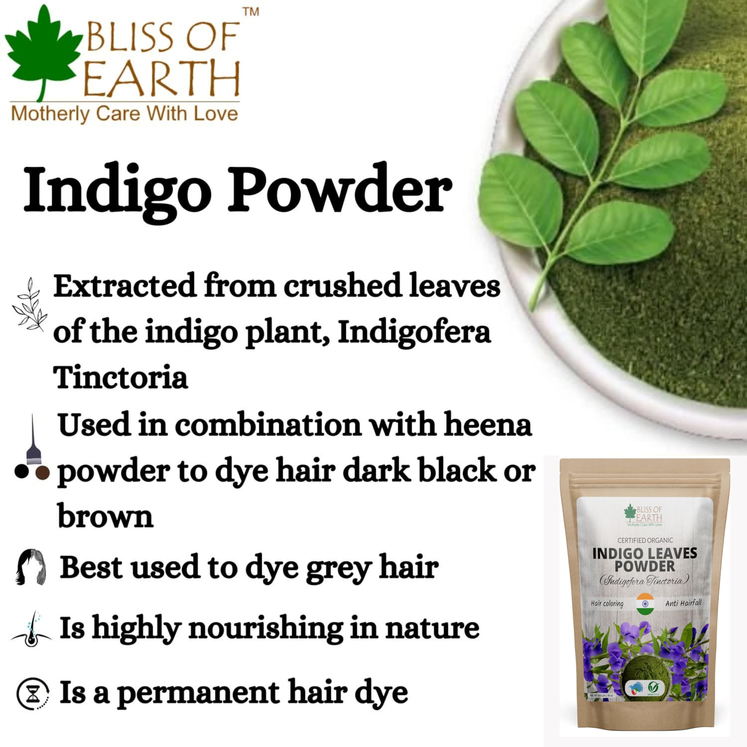 Bliss of Earth Indigo powder is certified organic and is made from organic indigo leaves. Indigo powder is used to get deep black or dark brown color. In case of gray white or blonde hair you have to follow the two steps process. First step is to apply Bliss of Earth Organic Henna powder. Second apply the Indigo powder after washing out the Henna powder. For normal hair mix Henna & Indigo powder to get shiny black color. Direction to use: 1. Mix the indigo powder with warm water in a glass bowl and make a thick spreadable paste. 2. Cover the paste with a plastic wrap for 15-20 minutes. 3. Apply Bliss of Earth Organic coconut oil in open areas like ears neck and hair line to prevent the coloring. 4. Apply the paste on your hair with a brush. 5. Once the hair are fully covered with the Indigo paste wear a shower cap and wait for 2-3 hours. Wait for 5-6 hours if you have mixed both Henna and Indigo powders. 7. Rinse your hair with runny water wihout using shampoo. 8. Let your hair dry. Cautions: For external use only. Do not apply on skin or near eyes. Indigo powder is best used in combination with Henna or after coloring your hair with Henna.