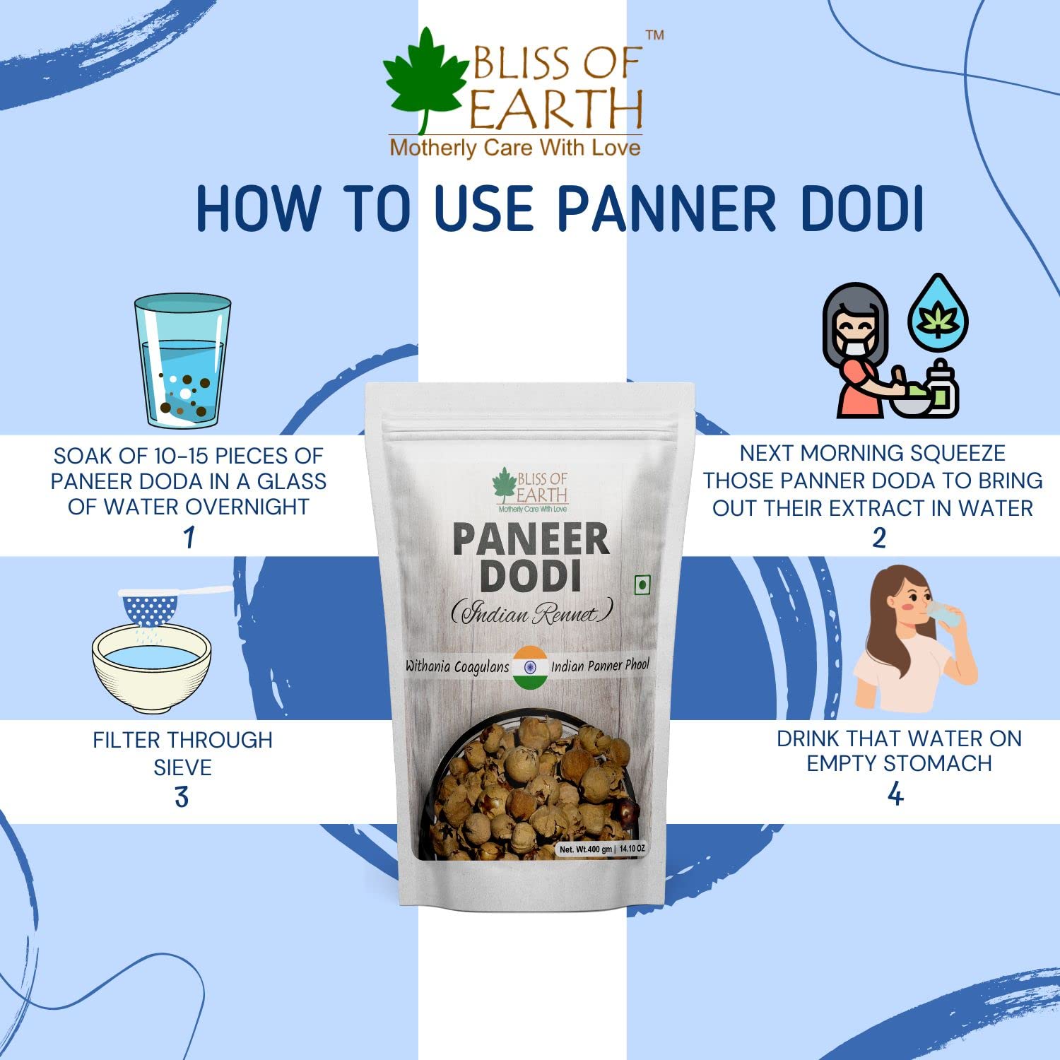 EASY TO USE: Its very easy to use paneer dodi. Soak 10-15 pcs. of Paneer dodi shrubs in a glass of water overnight. Filter the water and squeeze the shrubs to extract the remaining juice of the shrubs. Consume the water on empty stomach in the morning.