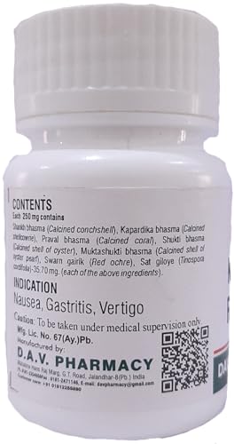 Each 125mg. contains Muktapishti (Pearl) Pravalpishti (Coral) Shukti bhasma (Shell of oyster) Varatika bhasma (Shell of cowrie) Shankh bhasma (Calcined conch shell) Swaran gairic (Red ochre) Guduchi satava (Tinospora cordifolia)-17.86 mg. (each of the above ingredients).
