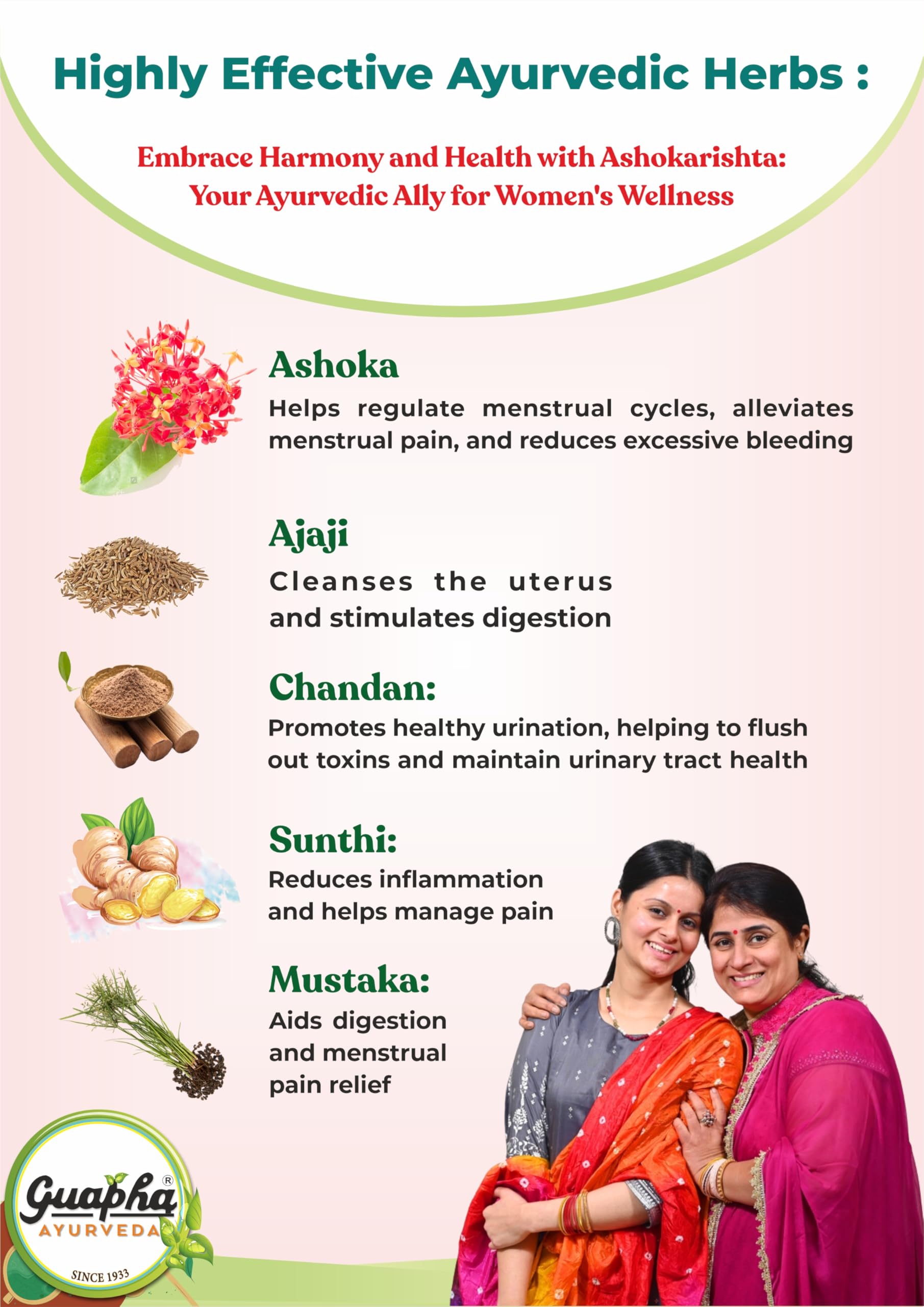 Unlock the secrets of women's wellness with Guapha Ayurveda Ashokarishta a natural elixir designed to support and nurture female reproductive health. Crafted with precision from the wisdom of Ayurveda this unique formulation features the powerful Ashoka tree extract and other time-honored herbs to provide holistic menstrual support. Guapha Ayurveda Ashokarishta is your ally in promoting hormonal balance and menstrual comfort. Experience the gentle yet effective benefits of this herbal tonic specially designed to help maintain a regular menstrual cycle and alleviate discomfort associated with it. This Ayurvedic elixir is more than just a remedy; it's a celebration of women's well-being. Guapha Ayurveda Ashokarishta works synergistically to nurture your body providing the support it needs for a balanced and harmonious menstrual experience. Crafted in a state-of-the-art facility Guapha Ayurveda Ashokarishta upholds the highest quality standards. Each bottle undergoes rigorous testing to ensure purity potency and safety offering you a trusted solution for your reproductive health. Prioritize your well-being with the wisdom of Ayurveda. Elevate your journey towards women's wellness with Guapha Ayurveda Ashokarishta â add this exceptional elixir to your cart now and embrace the natural balance your body deserves.