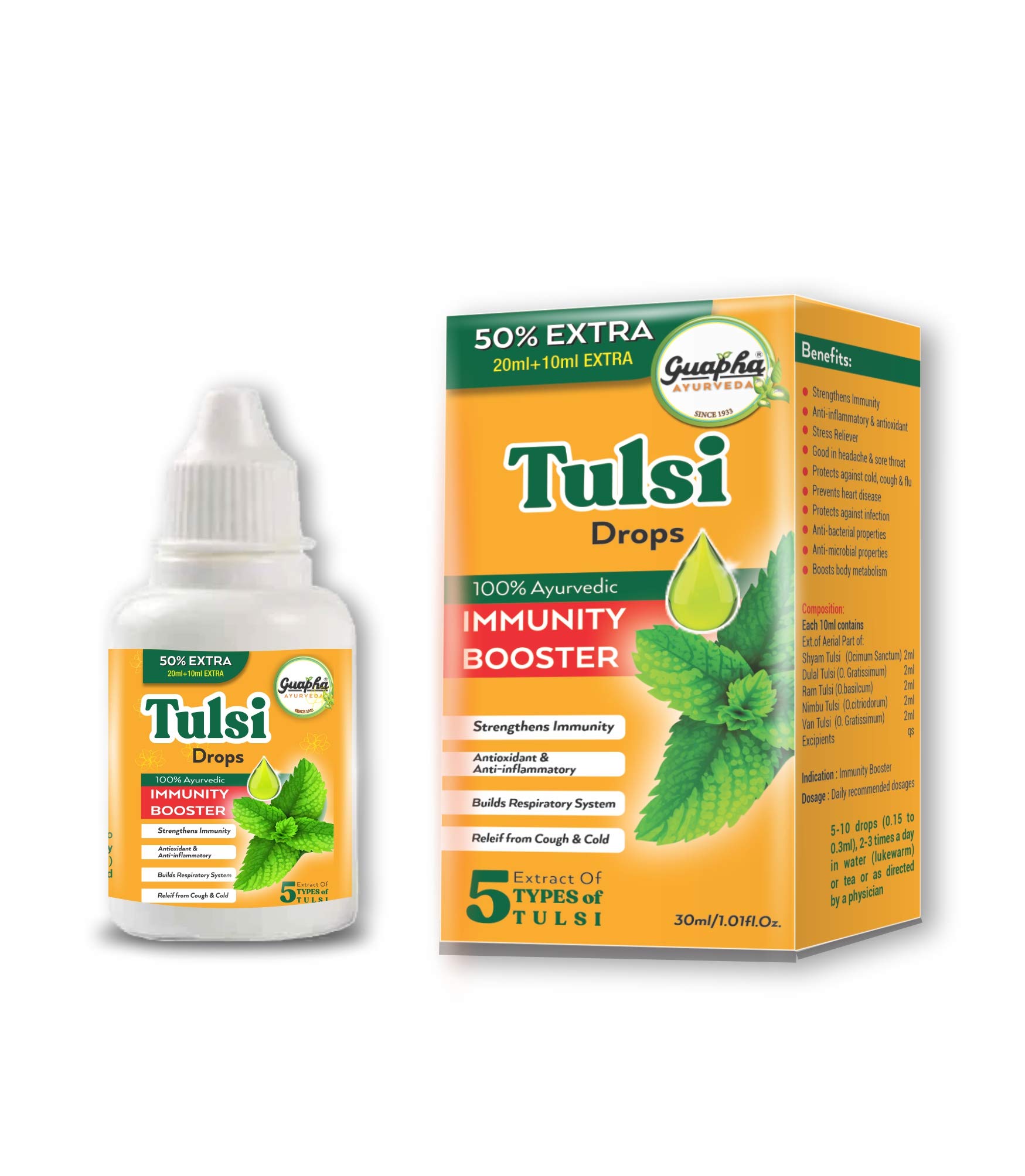 Guapha Ayurveda Tulsi Drops is made from the extract of 5 types of tulsi shyam tulsi vishnu tulsi ram tulsi nimbu tulsi and van tulsi. Tulsi is known for being a wonder herb which has innumerable health benefits like it is beneficial in skin health heart health joint health and digestive health.