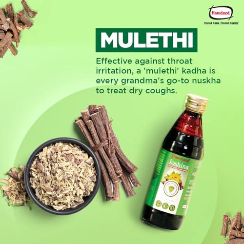 A blend of Traditional Herbs: Joshina Hamdard cough syrup combines Mulethi Unnab Amaltas and Tulsi for effective throat and respiratory relief