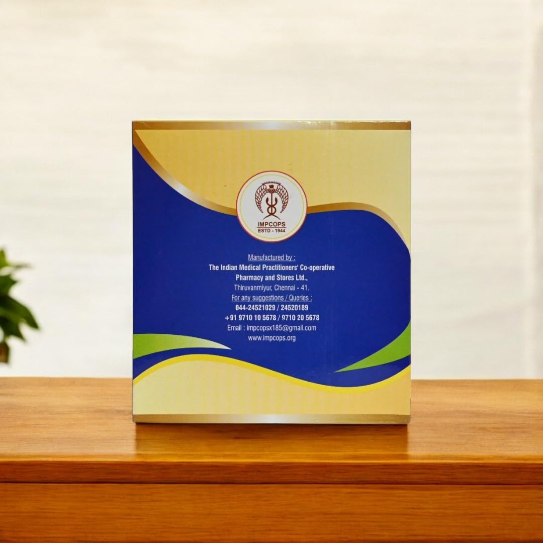 1) IMPCOPS BRAND CONFIDENCE: IMPCOPS is a leader in Research and Manufacturing of AYUSH Medicines (Ayurveda Siddha and Unani Medicines). It has a 75 year old heritage and holds a Pharma Manufacturing License #1 (A true Legacy!). IMPCOPS was created by association of Qualified Doctors to promote and support healthy living using Ayurvedic Siddha and Unani products. 2) CERTIFICATION: Made in GMP Certified factory. 3) Natural: All Vegetarian Ingredients.
