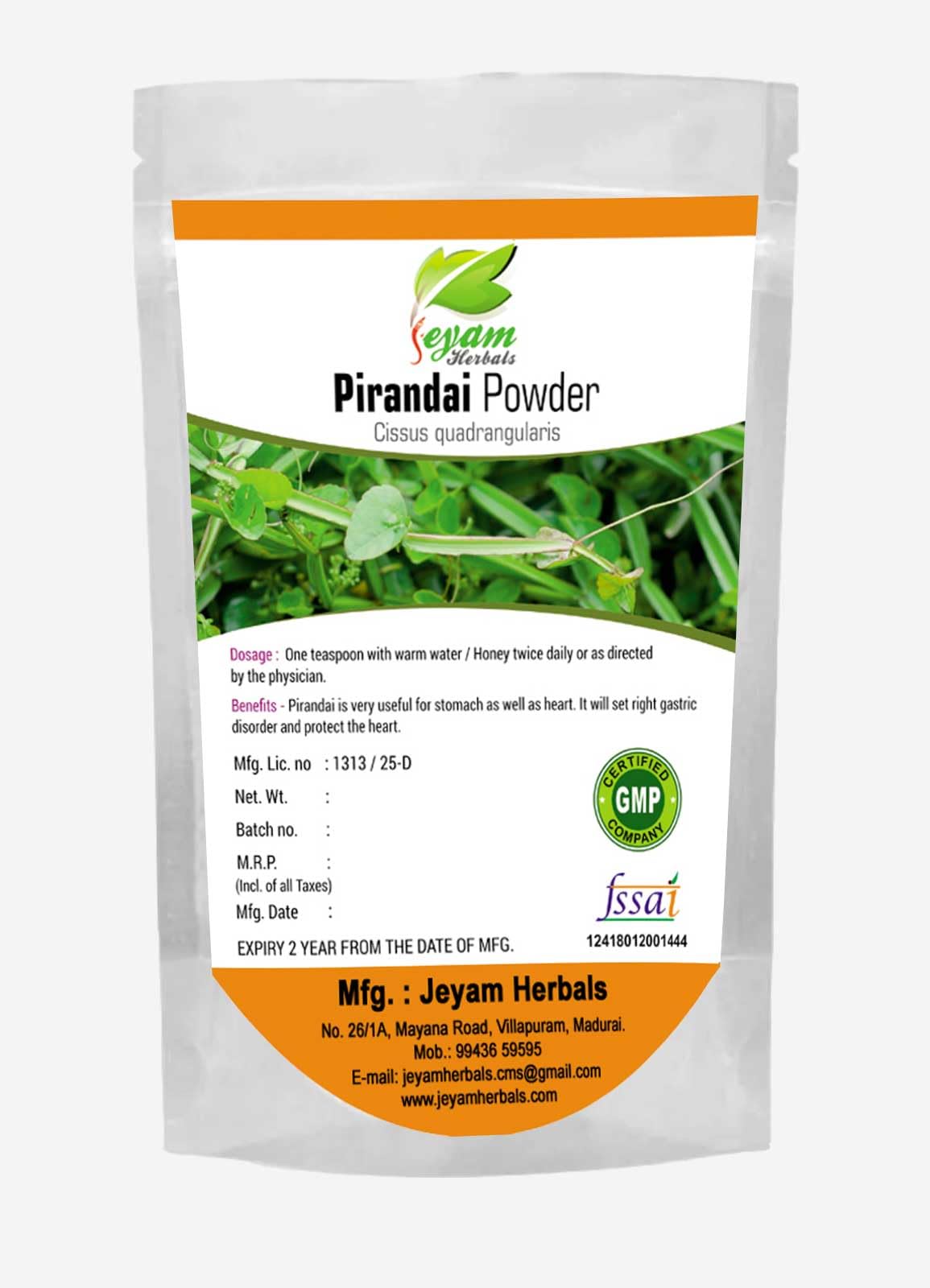 Pirandai powder derived from the Cissus quadrangularis plant is a traditional herbal remedy known for its extensive health benefits. Hadjod is widely used in Ayurveda and Siddha medicine for its potent anti-inflammatory and analgesic properties. Regular consumption of pirandai powder is believed to strengthen bones making it beneficial for individuals with osteoporosis or fractures. Hadjod (pirandai powder) helps in digestive health by alleviating indigestion flatulence and constipation. Pirandai powder is also reputed for its ability to enhance appetite and promote weight gain in undernourished individuals. Additionally nalleru plant (pirandai powder) supports cardiovascular health by reducing cholesterol levels and improving blood circulation. For women it is known to alleviate menstrual discomfort. Topically pirandai powder can be used to treat wounds burns and skin infections due to its antimicrobial properties. To use mix a teaspoon of pirandai powder with water or honey and consume daily or apply a paste externally as needed. Always consult with a healthcare professional before starting any new herbal regimen.
