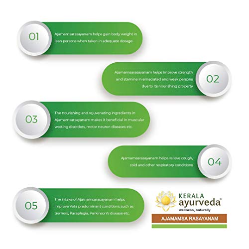 Ajamamsam Mutton Meat Dct. 50 g Vasa Adathoda vasica Rt. Dct. 70 g Bala Sida cordifolia Rt. Dct. 35 g Dasamoola Ten root herbs Rt./St.Bk./Fr. Dct. 110 g Aashali Lepidium sativum Sd. Pdr. 5 g Aswagandha Withania somnifera Rt.Tr. Pdr. 5 g Sunthi Zingiber officinale Rz. Pdr. 5 g Ela Elattaria cardamomum Fr. Pdr. 5 g Wheat Triticum aestivum Sd. Pdr. 5 g Tvak Syzygium aromaticum Fr. Pdr. 5 g Lavanga Cinnamomum zeylanicum St. Bk. Pdr. 5 g Jati Myristica fragrans-Nutmeg Fr. Pdr. 5 g Jatiphala Myristica fragrans-Mace Fr. P. Pdr. 5 g Jeera Cuminum cyminum Sd. Pdr. 5 g Bakuchi Psoralea corylifolia Sd. Pdr. 5 g Kalijeera Nigella sativa Sd. Pdr. 5 g Dhanyaka Coriandrum sativum Sd. Pdr. 5 g Maricha Piper nigrum Fr. Pdr. 5 g Nagakesara Messua ferrea Fl. Pdr. 5 g Misreya Foeniculum vulgare Sd. Pdr. 5 g Jyothishmati Celastrus paniculatus Sd. Pdr. 5 g Methi Trigonella foenum graecum Sd. Pdr. 5 g Kutaja Holarrhena antidysenterica Sd. Pdr. 5 g Vidanga Embelia ribes Sd. Pdr. 5 g Vrihi Oryza sativa Sd. Pdr. 5 g Kali musli Curculigo orchioides Rz. Pdr. 5 g Haridra Curcuma longa Rz. Pdr. 5 g Pippali Piper longum Fr. Pdr. 5 g Thila Thaila Sesamum indicum Sd. Ol. 5 g Ghritha Ghee Lq. 75 g Guda Jaggery 300 g Madhu Honey Lq. 75 g"