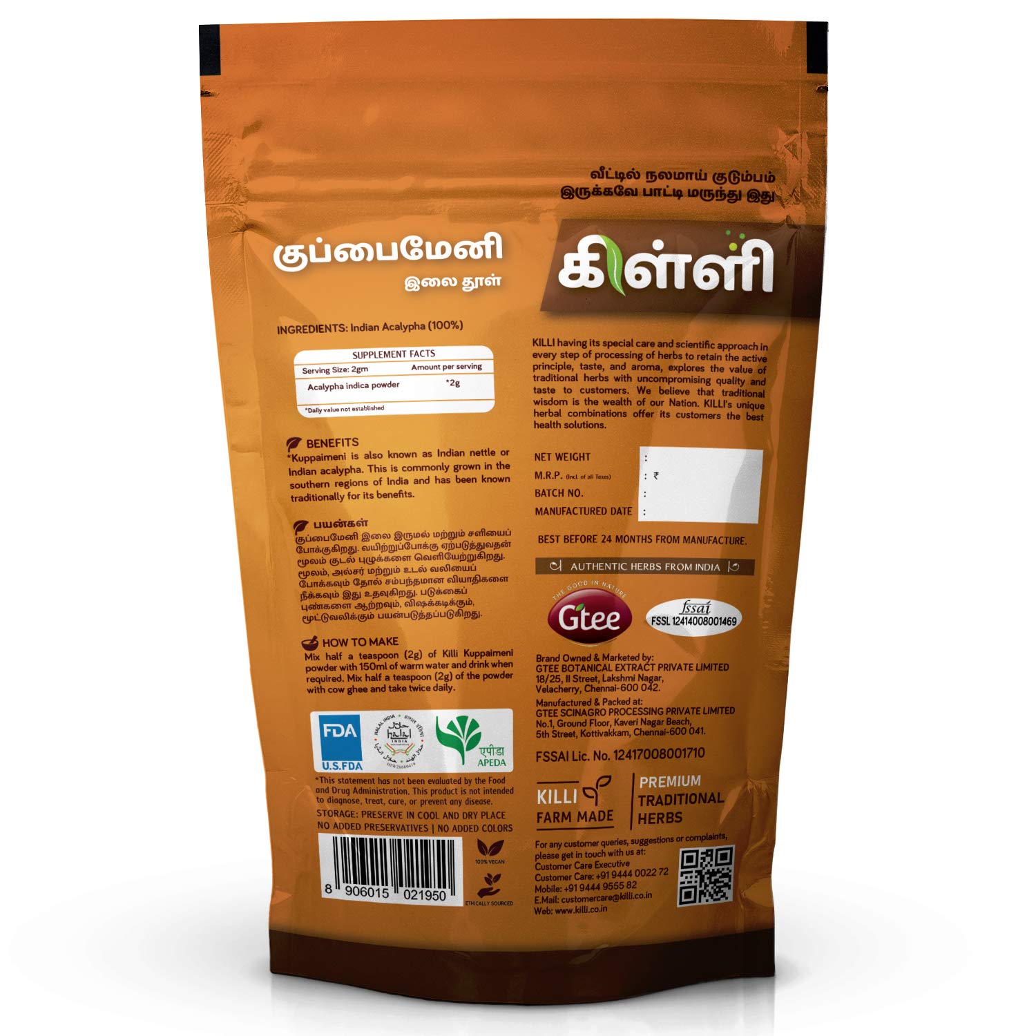 USFDA CERTIFIED - KILLI Herbs are certified by the United States Food and Drug Administration FSSAI Food Safety and Standards Authority of India HALAL India. All the herbs are grown by our farmers naturally with no added chemical fertilizers. They are cle