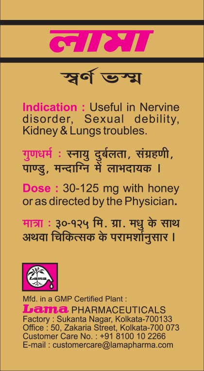 Lama Swarna Bhasma A quality classical Ayurvedic product from Lama Pharmaceuticals. Product is prepared as per the process mentioned in the Ayurvedic Shastras.