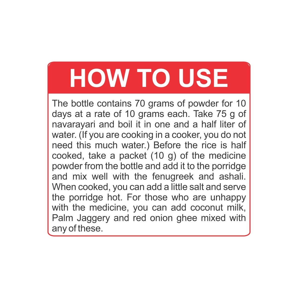The bottle contains 70 grams of powder for 10 days at a rate of 10 grams each. Take 75 g of navarayari and boil it in one and a half liter of water. (If you are cooking in a cooker you do not need this much water.) Before the rice is half cooked take a packet (10 g) of the medicine powder from the bottle and add it to the porridge and mix well with the fenugreek and ashali. When cooked you can add a little salt and serve the porridge hot. For those who are unhappy with the medicine you can add coconut milk Palm Jaggery and red onion ghee mixed with any of these.