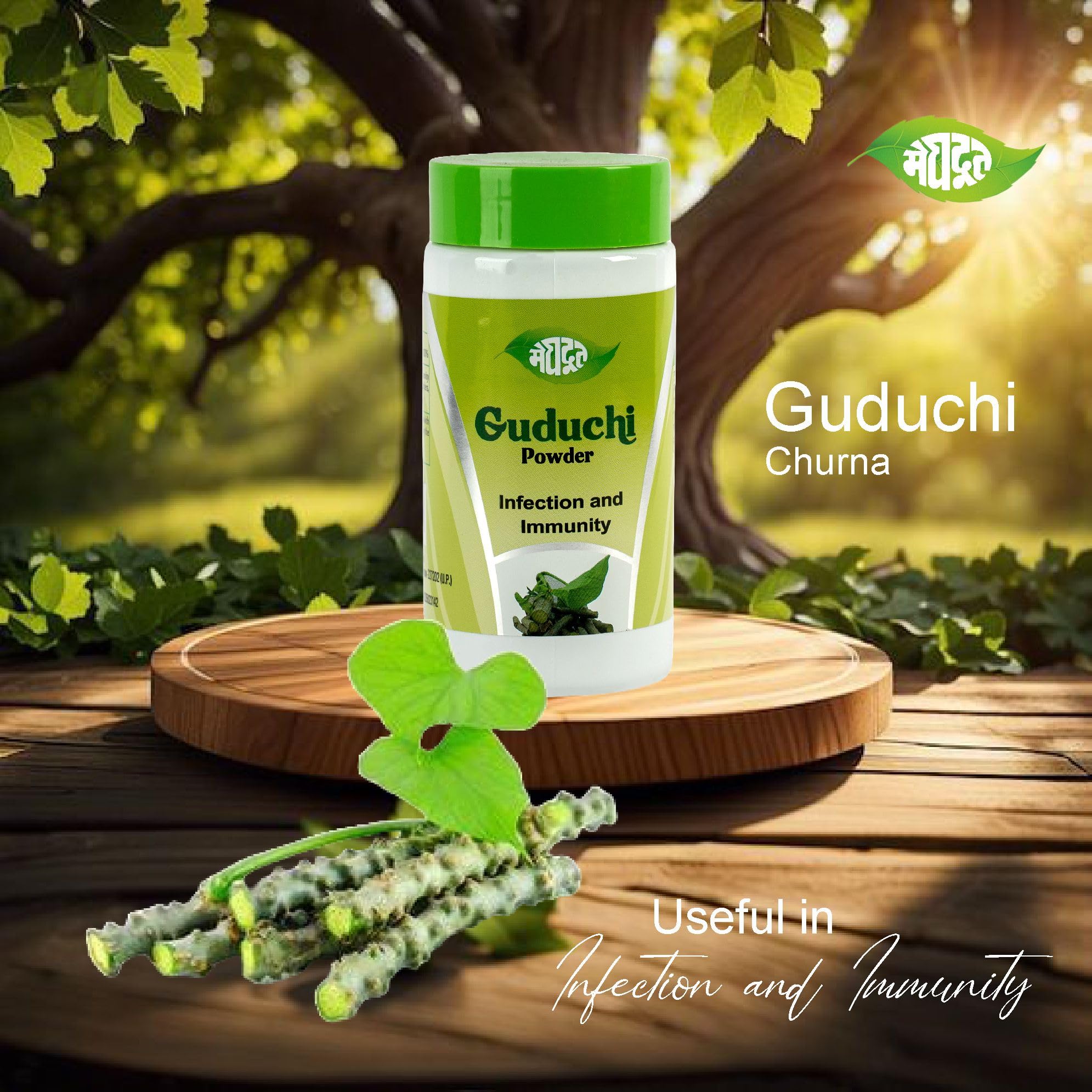 Introducing Meghdoot Ayurvedic Guduchi Churan Powder enriched with natural extracts of Guduchi stem meticulously crafted to boost immunity and combat infections. Each pack contains 100 grams of premium quality powder offering a potent solution for enhancing overall health and well-being. Guduchi also known as Tinospora cordifolia is revered in Ayurveda for its powerful immunomodulatory properties that strengthen the body's defense mechanisms against infections. It promotes the production of white blood cells enhancing the immune response to pathogens. Additionally Guduchi's antioxidant properties help neutralize free radicals and reduce oxidative stress contributing to overall health maintenance. Meghdoot Ayurvedic Guduchi Churan Powder is formulated to preserve the natural efficacy of Guduchi ensuring maximum potency. Free from artificial additives and preservatives this powder provides a pure and natural approach to immune support. Ideal for daily use simply mix the powder with water or honey to create a nourishing drink supporting immune function and vitality. With a pack of four you have an ample and sustainable supply to maintain immunity and combat infections effectively. Whether you are looking to boost your immune system or enhance your body's ability to fight infections naturally Meghdoot Ayurvedic Guduchi Churan Powder is your reliable companion. Embrace the healing traditions of Ayurveda and experience the immune-boosting benefits of Guduchi for a healthier more resilient body. Elevate your well-being with Meghdoot Ayurvedic Guduchi Churan Powder and empower your immune system naturally.