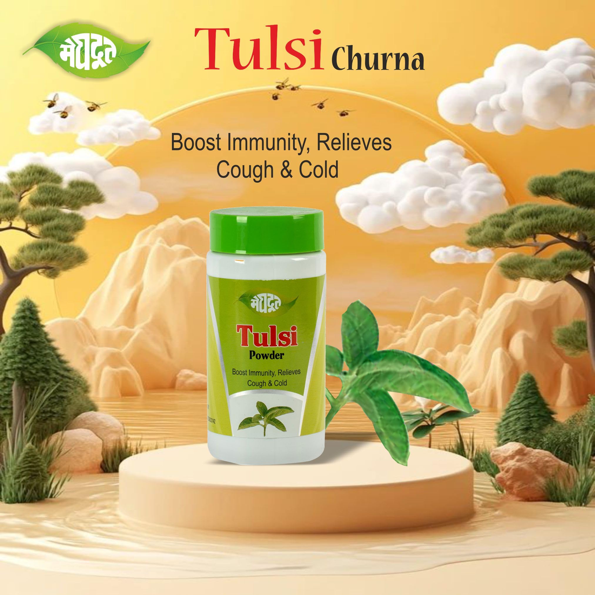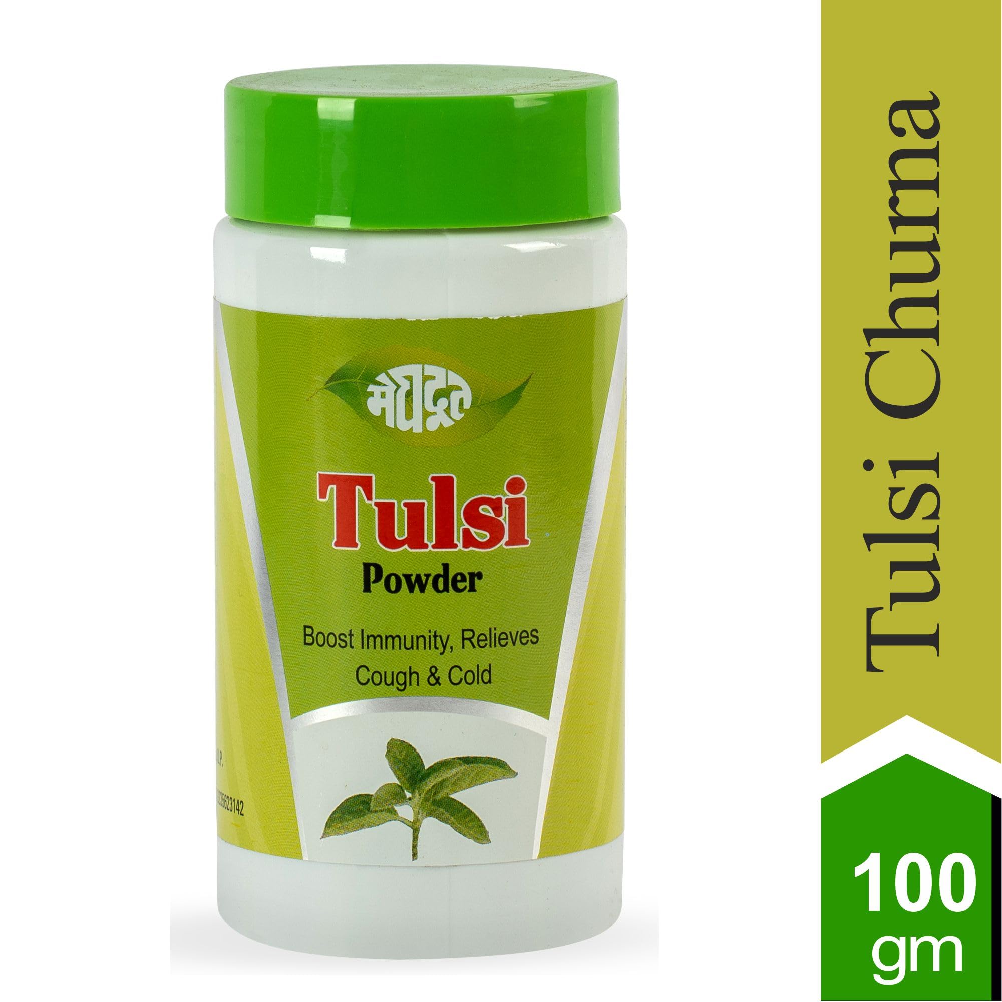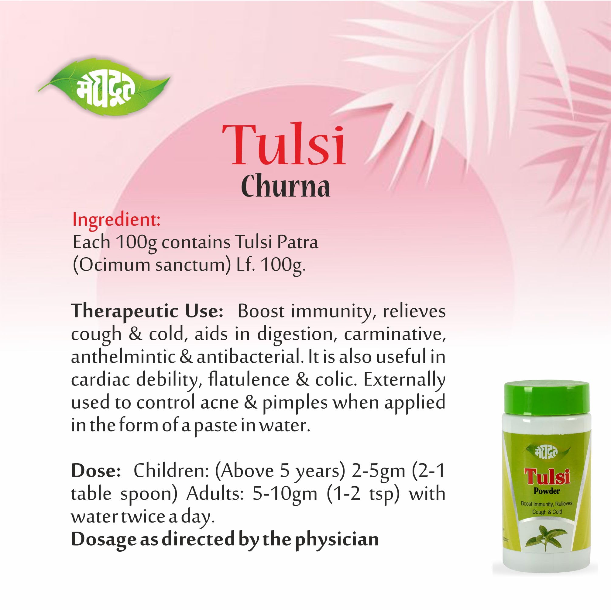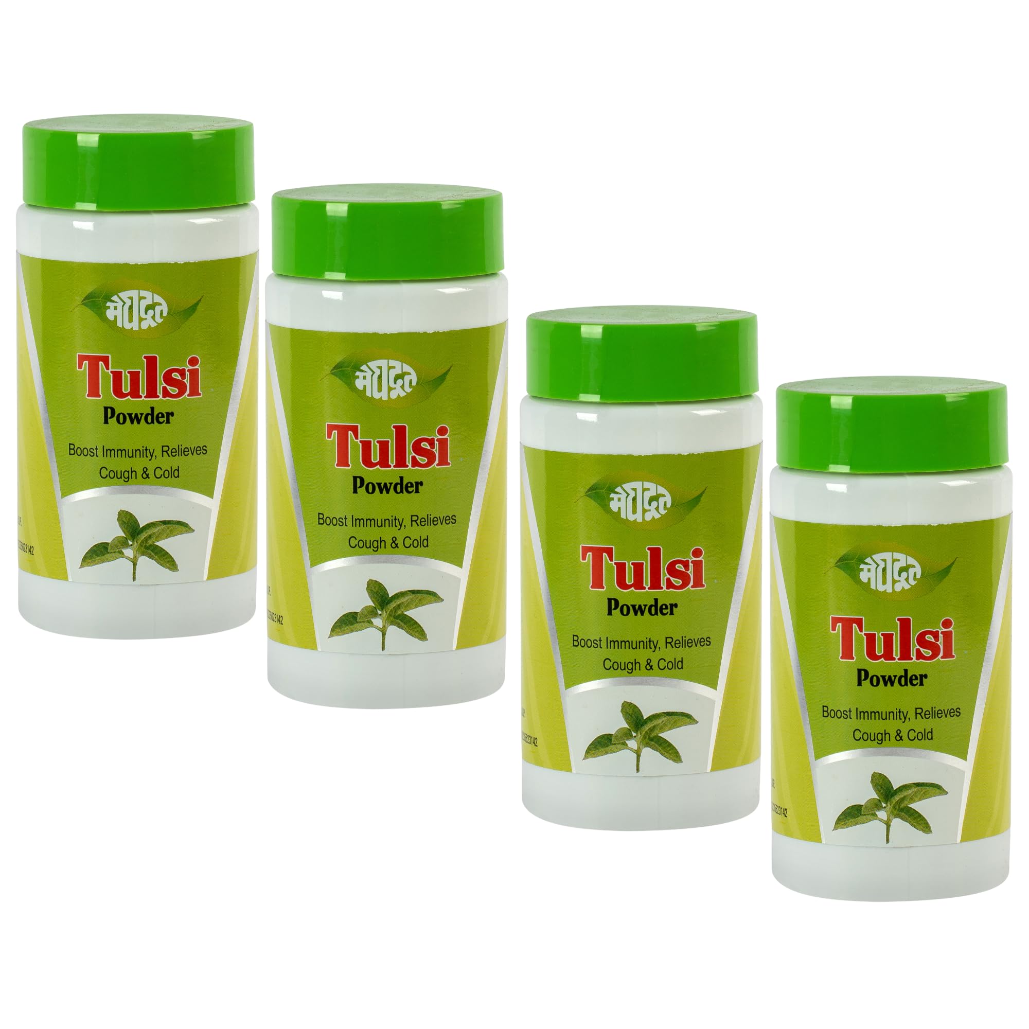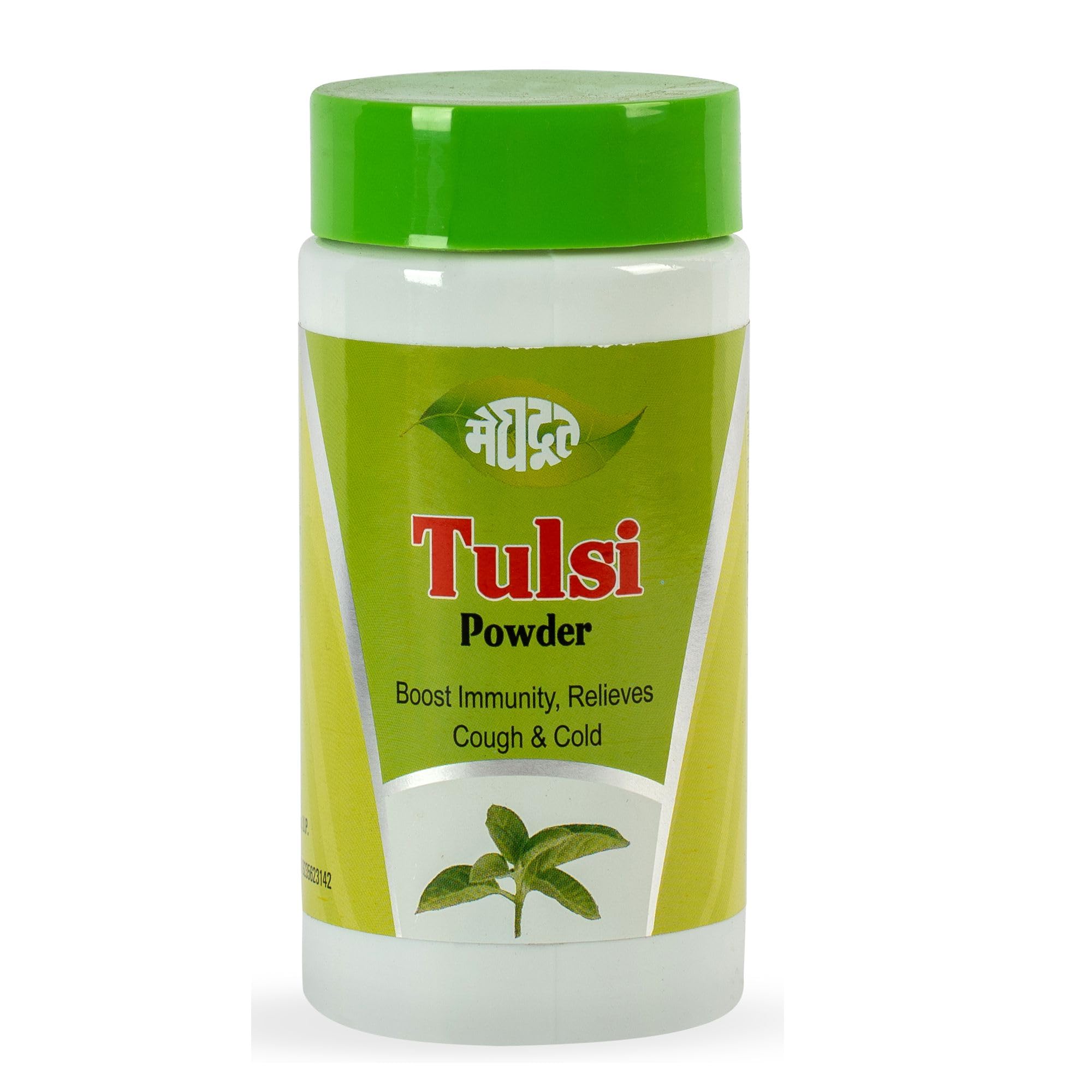 Tulsi powder for hair benefits by rejuvenating the hair follicles and strengthening the roots. Tulsi extracts clears and soothes scalp with its natural organic properties.This is a triple sifted microfine multipurpose powder which is suits all skin and hair types. This tulsi powder is completely free from all kinds of chemicals or preservatives and safe to use. Owing to its nutritional properties it is widely used as an important beauty ingredient. Tulsi Powder is best for getting relief from itchy scalp and skinIngredient: Ocimum sanctum (Leaf) 100% (Tulsi Patra) Therapeutic Use: Boost immunity relieves cough & cold aids in digestion carminative anthelmintic & antibacterial. It is also useful in cardiac debility flatulence & colic. Externally used to control acne & pimples when applied in the form of a paste in water. Dose: Children: (Above 5 years) 2-5gm (2- 1 table spoon) Adults: 5-10gm (1-2 tsp) with water twice a day.