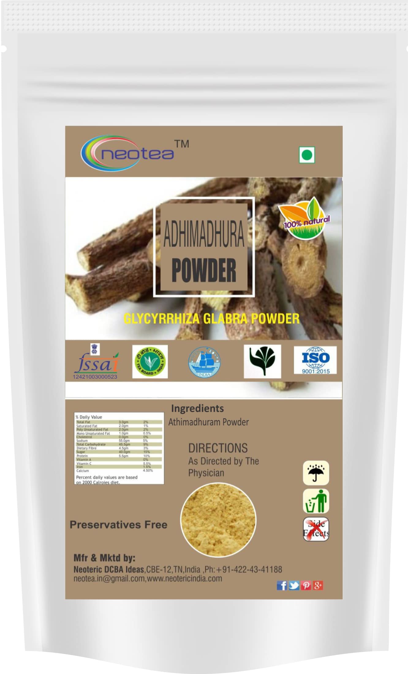 Neotea athimadhuram powder (about Pretorius) - 300 Gm Neotea a brand of health and household vitamins and dietary supplements. The products spectrum we offer to our customers includes Dry Fruit Herbal Powder Organic Cocoa Powder and many more. Athimathuram or scientifically called as Glycyrrhiza glabra or Glyceria Glabra is a cultivated Liquorice plant hailed for its medicinal properties. It is commonly called as sweetwood. Athimathiram is called as Mulethi in Hindi. In Tamil Nadu we call it as 'Athimathuram' or 'Athimadhuram'. It belongs to the Fabaceae family of flowering plants.