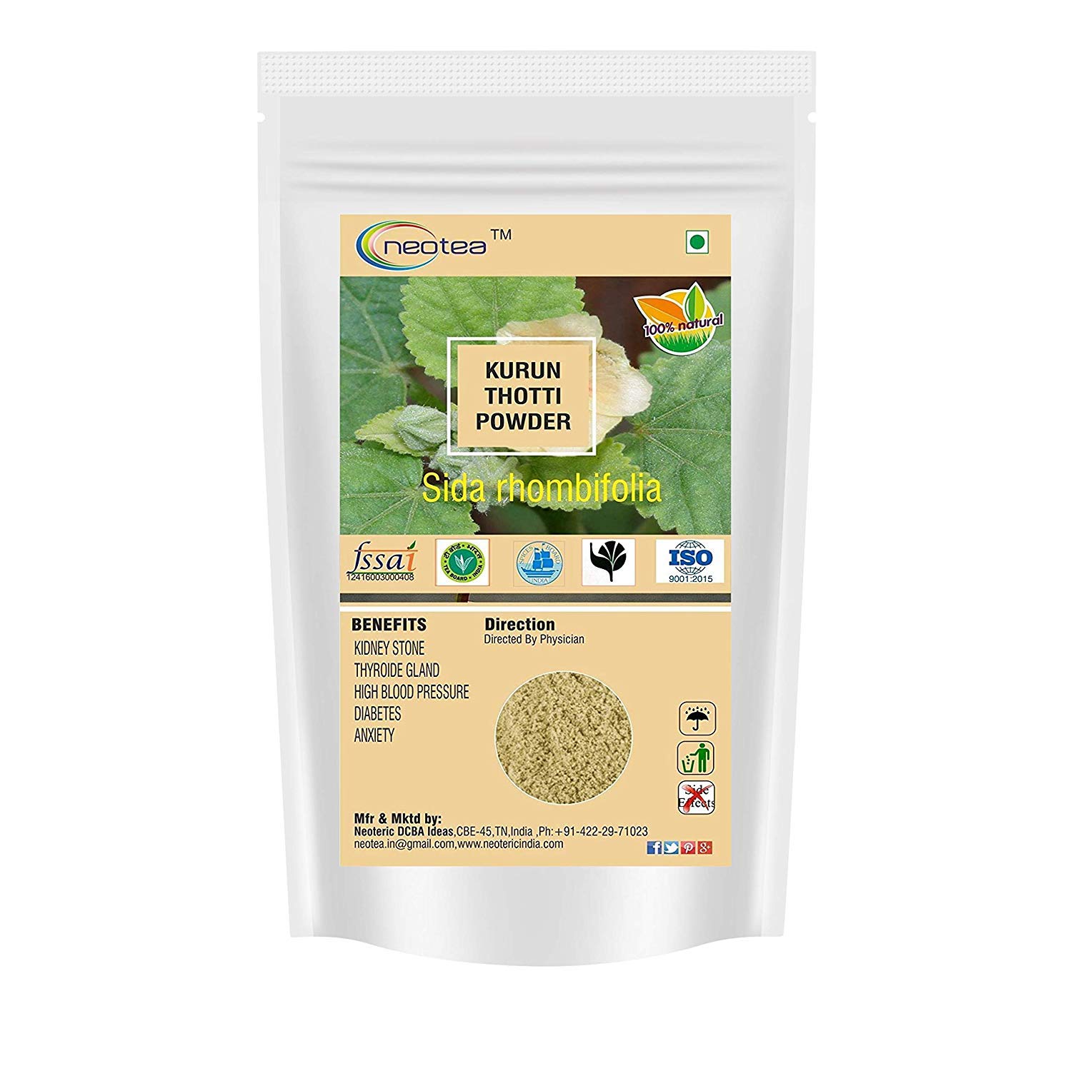 Sida cordifolia is an erect perennial that reaches 50 to 200 cm (20 to 79 in) tall with the entire plant covered with soft white felt-like hair that is responsible for one of its common names "Flannel weed". The stems are yellow-green hairy long and slender. Embrace the power of traditional Ayurvedic wellness with Neotea Kurunthotti | Chitaamuttie Bala Powder | Kurunthotti Ver Powder Country Mallow Dried Root Powder. This natural herbal supplement is made from 100% pure Kurunthotti (Country Mallow) dried root offering numerous health benefits particularly for hair care. Each pack contains 200 grams of fine powder ensuring you receive a pure and effective product. Key Features: 100% Pure and Natural: Our Kurunthotti powder is made from carefully dried and finely ground Country Mallow roots ensuring you receive a product that is pure and natural with no additives. Chemical-Free and No Preservatives: We prioritize your health by ensuring our product is free from chemicals preservatives and any artificial ingredients. Enjoy the purity of a natural supplement. Ayurvedic Herbal Supplement: Kurunthotti also known as Chitaamuttie Bala is a well-known herb in Ayurveda traditionally used to promote healthy hair growth and maintain natural hair color. Promotes Healthy Hair Growth: This herbal powder supports hair health by nourishing the scalp strengthening hair roots and promoting the growth of strong healthy hair. Maintains Hair Color: Regular use of Kurunthotti powder can help maintain your hairâs natural color preventing premature graying and enhancing overall hair health. Versatile Use: This powder can be used in various traditional recipes hair masks or as directed by an Ayurvedic practitioner for optimal results. Quality Assured: Produced under stringent quality control measures to ensure the highest standards of purity potency and effectiveness.