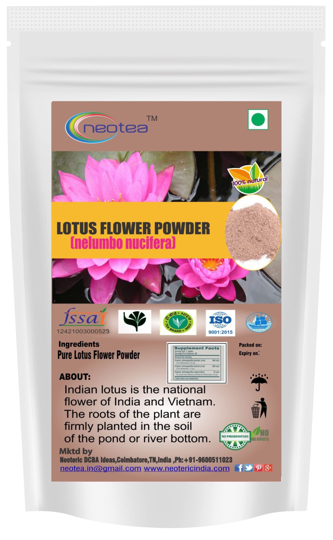 Neotea nymphaea nelumbo lotus flower powder 300 gm. Neotea a brand of health and household vitamins and dietary supplements. The products spectrum we offer to our customers includes Dry Fruit Herbal Powder Organic Cocoa Powder and many more. The lotus has the title of Indiaâs national flower and is a symbol of purity in Buddhist and Hindu traditions.A therapeutic formulation made to make your skin & hair feel a lot better. Powder stains protect clothes and other surfaces. Scent so alluring you'll want to reapply it with every chance you get. Moisturize and rejuvenate yourself with every use. The powder formulation makes it easy to apply and benefit the skin and hair directly without damaging the protective barrier.