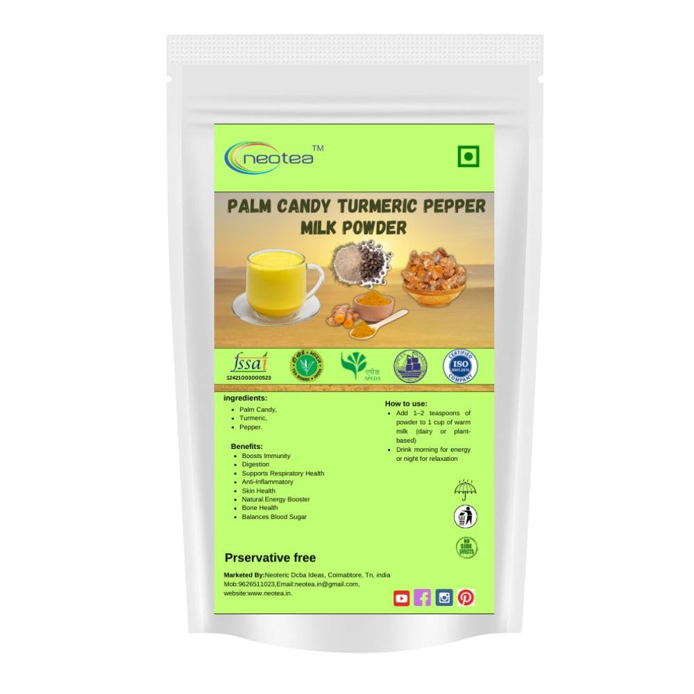 Indulge in the wholesome goodness of Neotea Palm Candy Turmeric Pepper Milk Powder a perfect blend of health and taste. Crafted with premium ingredients this healthy milk mix combines the richness of turmeric and pepper with the natural sweetness of palm candy creating a traditional Ayurvedic drink that offers multiple health benefits.