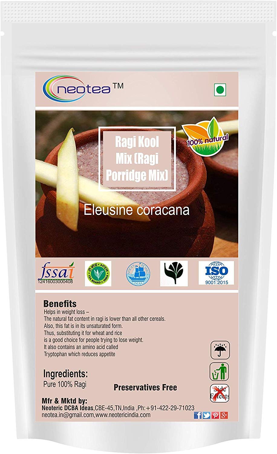 Neotea Ragi Kool Mix is an ideal choice for those looking for a gluten-free nutritious and energy-boosting breakfast or snack. Made from premium ragi (finger millet) this porridge mix is rich in fiber protein and essential vitamins and minerals such as iron calcium and magnesium making it an excellent choice for maintaining overall health and well-being. Packed with high-quality protein and dietary fiber Neotea Ragi Kool Mix helps to keep you feeling fuller for longer supports digestion and provides sustained energy throughout the day. This healthy porridge mix is the perfect way to start your morning or to enjoy as a mid-day snack. The easy-to-prepare mix can be cooked in just minutes by adding water or milk. Customize it with your favorite fruits nuts or sweeteners to create a meal tailored to your tastes. Whether youâre looking for a comforting breakfast or a nutritious treat Neotea Ragi Kool Mix offers a delicious wholesome option.