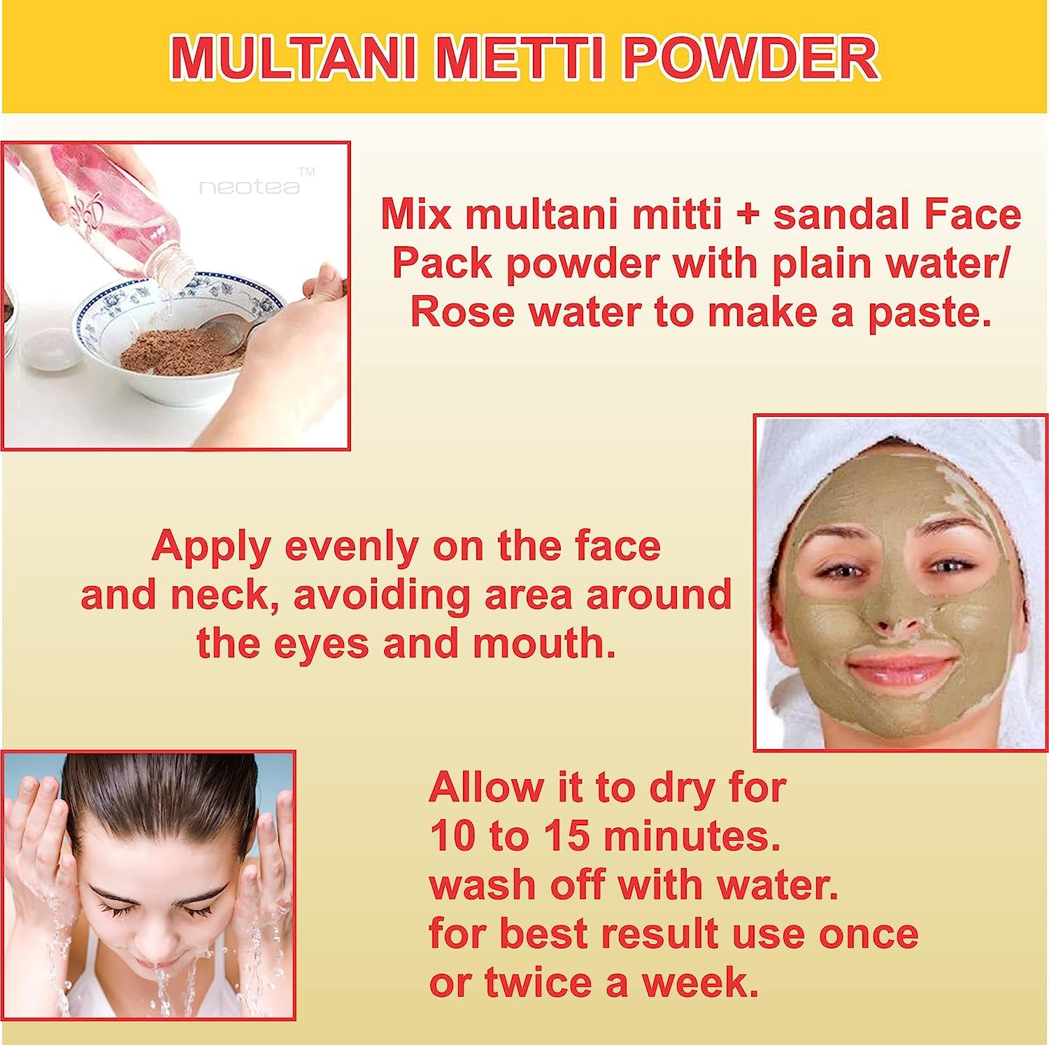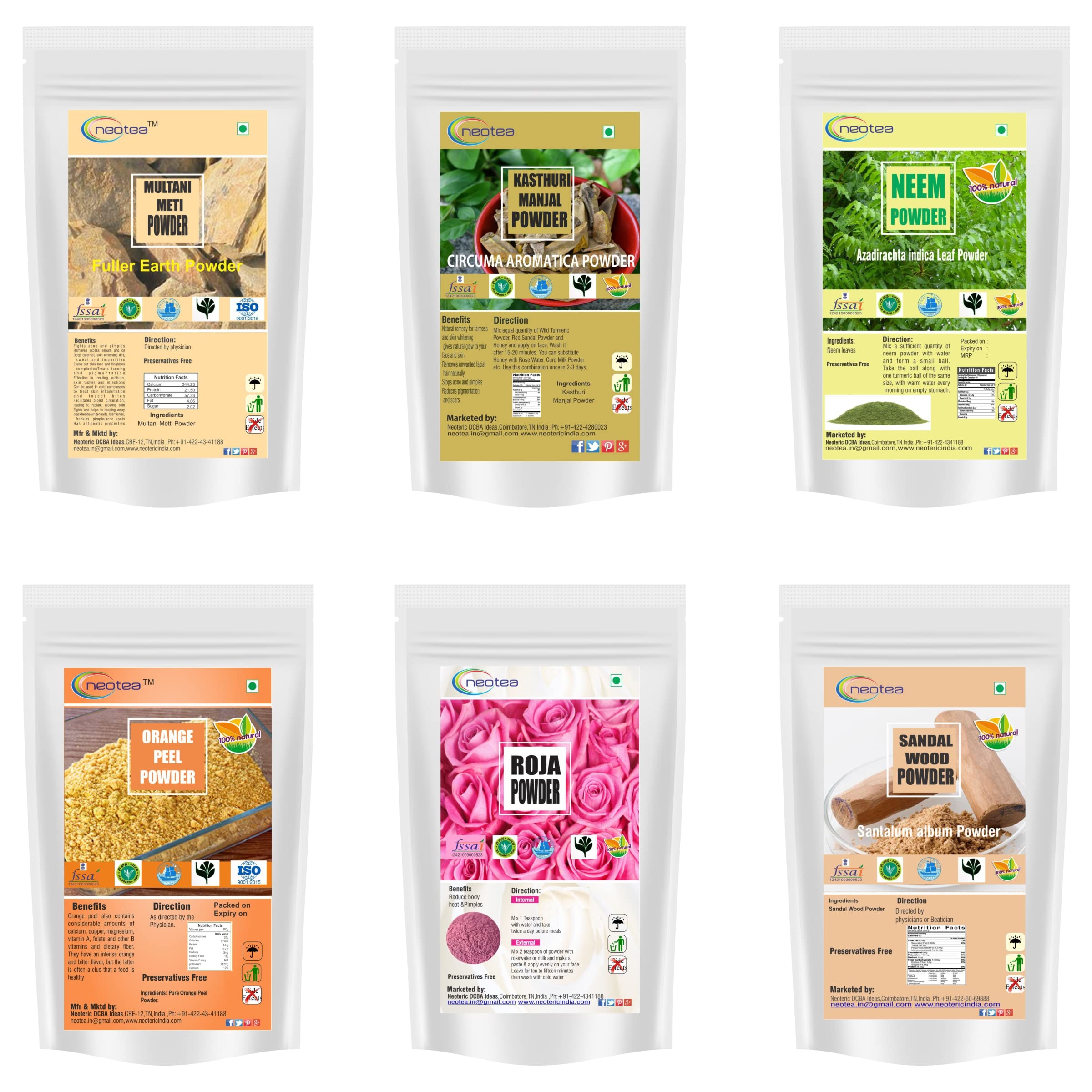 Neotea Sandalwood (chandan) Powder Rose Petal Powder Multani Mitti Powder Orange Peel Powder Neem Leaf Powder And Kasturi Turmeric Powder for Face and Skin Care.