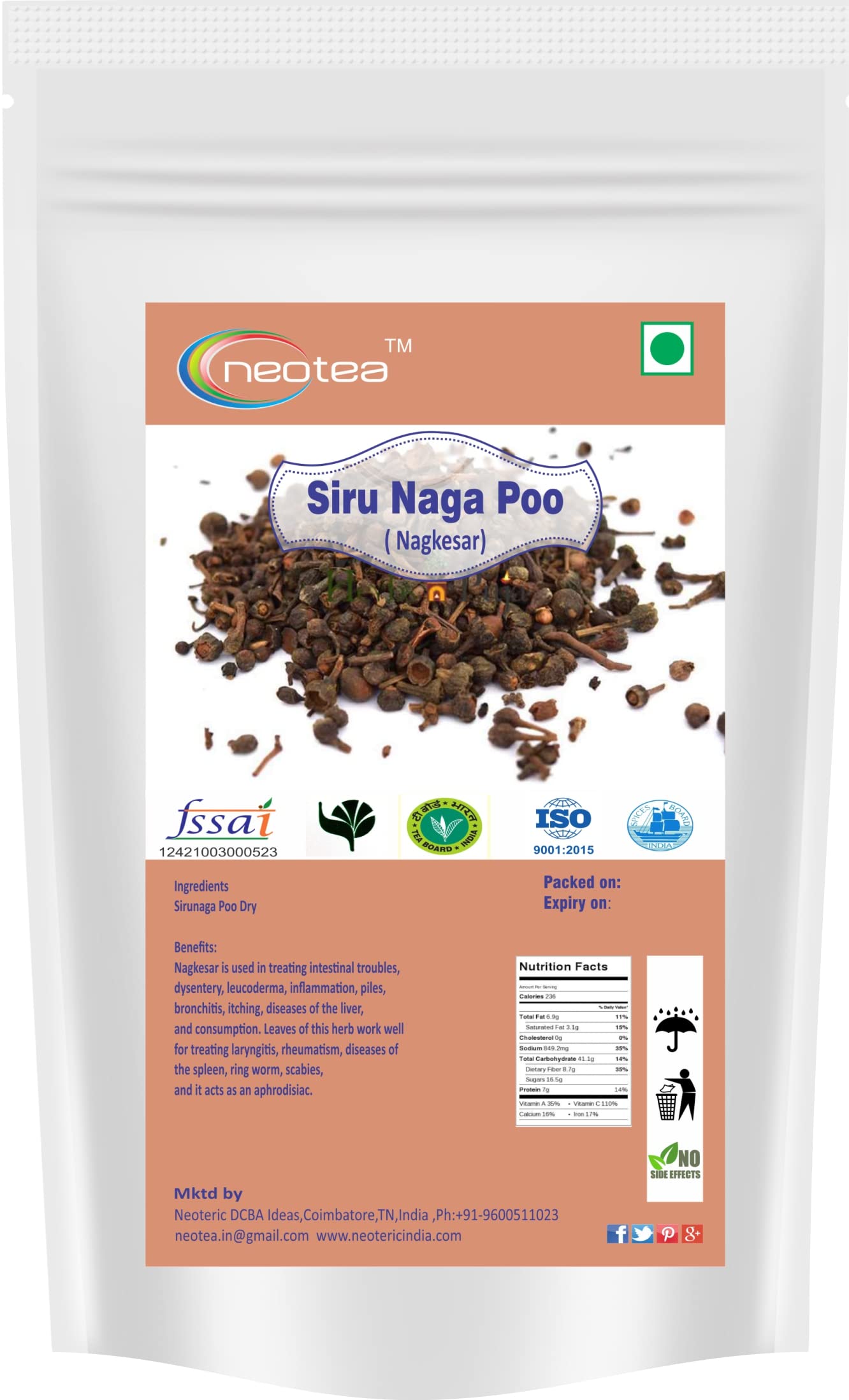 Experience the purity and traditional value of Neotea Siru Naga Poo (Nagkesar / Mesua Ferrea) a natural herbal ingredient with deep roots in Ayurveda Indian cuisine and spiritual practices. These aromatic dried flower buds are carefully harvested and hygienically packed to retain their natural essence and therapeutic properties. Known for its calming aroma and medicinal benefits Nagkesar has been traditionally used to support digestion reduce inflammation and balance the bodyâs energies. It also holds an important place in culinary applications adding flavor and fragrance to sweets herbal teas and Ayurvedic formulations. Perfect for those who value natural living this 10GM pack of Siru Naga Poo is free from preservatives additives and artificial chemicals making it safe for regular external or culinary use.