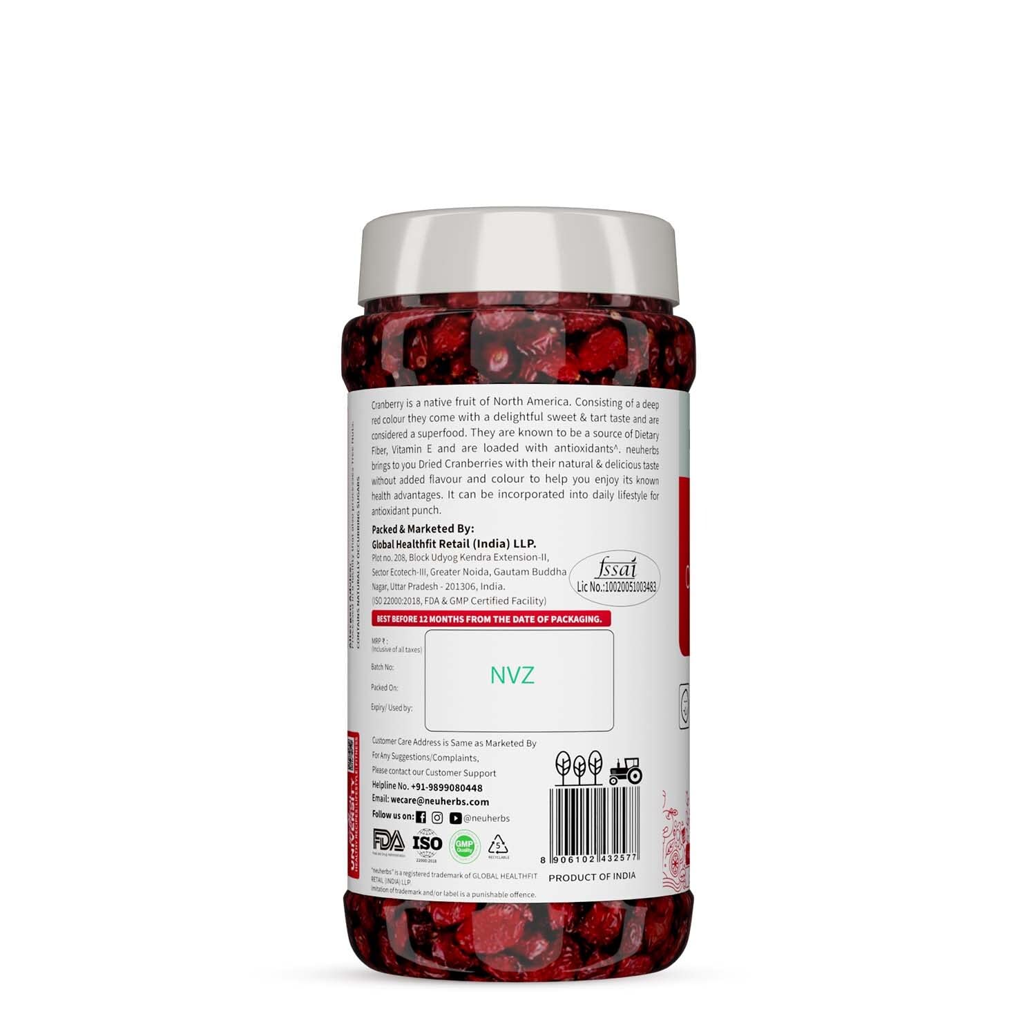 Cranberries are loved & used by many due to their unique sweet & tangy taste. Cranberries are high in Antioxidants which gives them an attractive natural deep red colour. Also they are known to be a source of Vitamin E and are naturally free from cholesterol these benefits of cranberries make them an incredible option for excellent immunity a healthy heart & skin. neuherbs brings to you the goodness of dried cranberries with no artificial preservatives to offer you an authentic delightful taste of dried cranberries that is free of bad stuff. Incorporating dried cranberries in your daily homemade recipes can impart a delicious taste & nutrition.