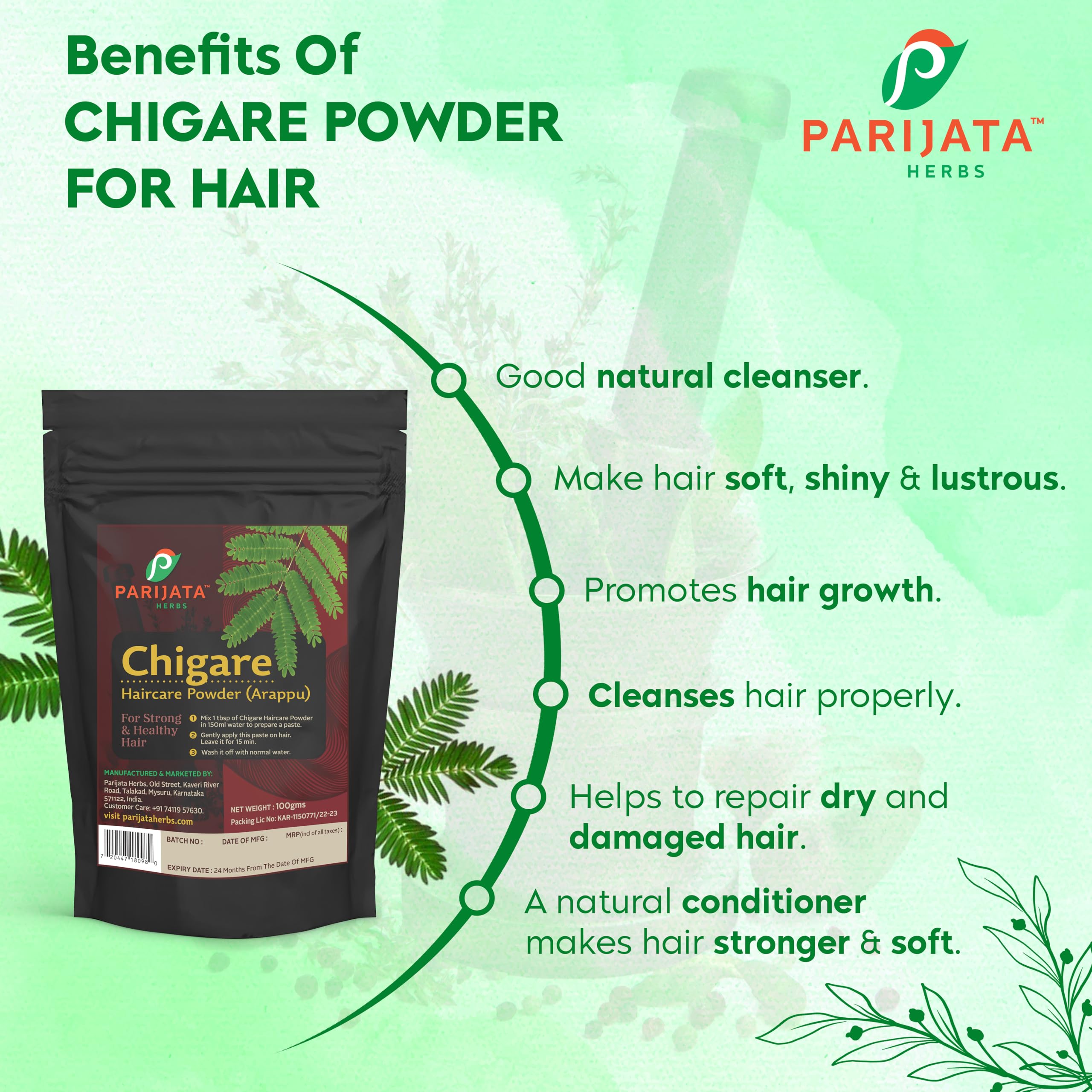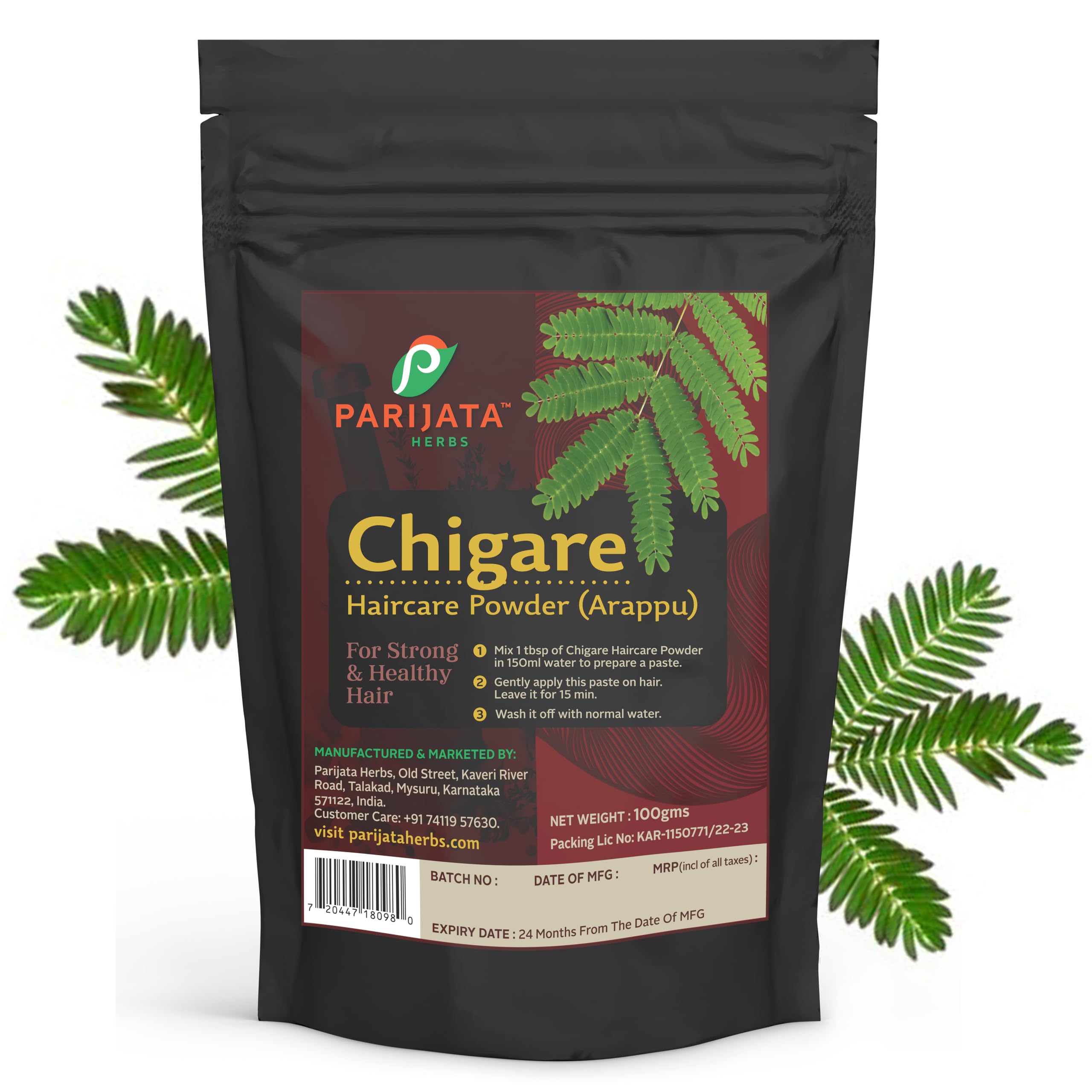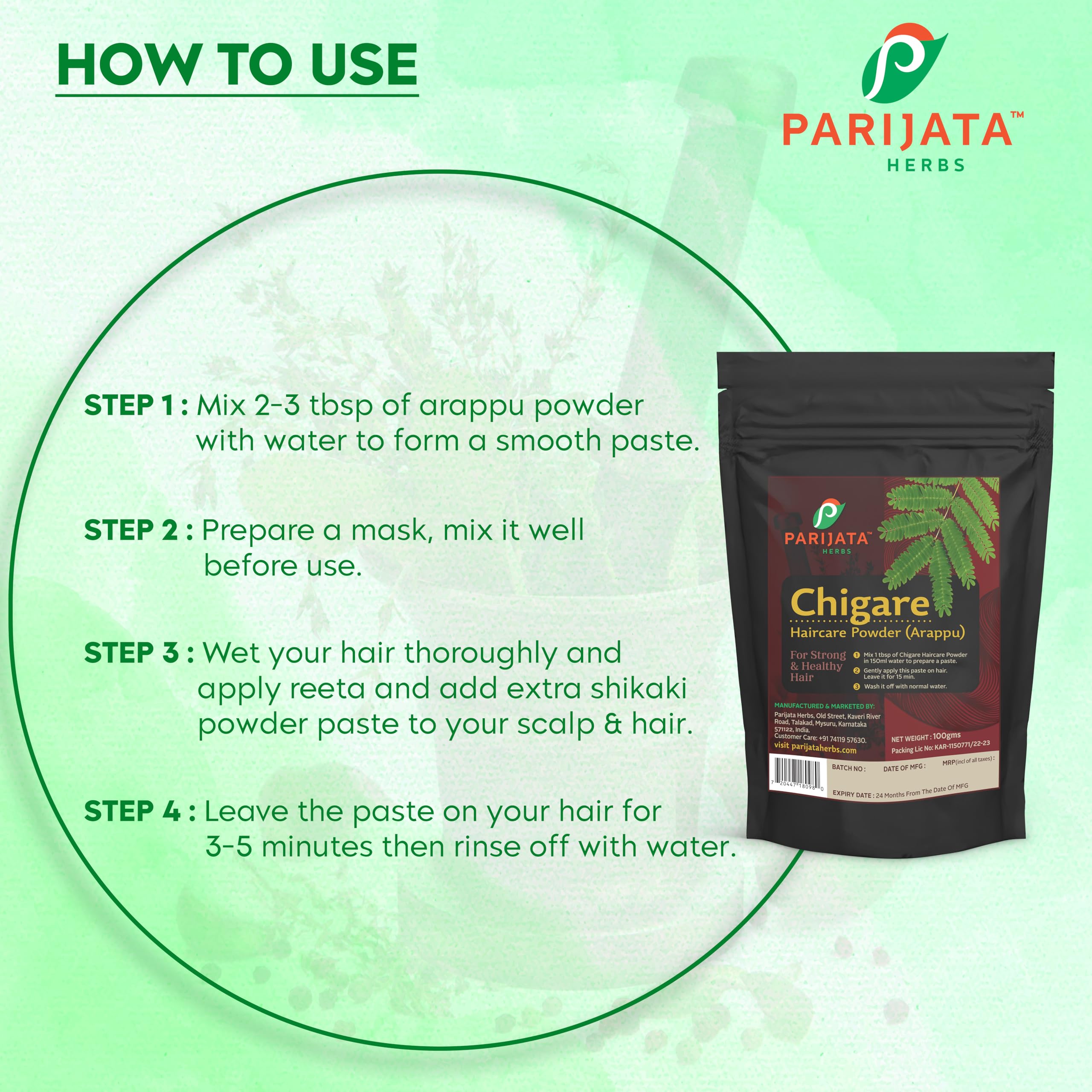 Discover the traditional wisdom of hair care with Parijata Herbs Chigare Haircare Powder (Arappu) a natural hair treatment that promotes strong and healthy hair. This 100g powder formulation follows time-tested methods - simply mix 1 tablespoon with 150ml water to create a smooth paste apply gently to your hair and leave for 15 minutes before rinsing with normal water. The convenient resealable pouch keeps the powder fresh throughout its 24-month shelf life. Perfect for those seeking traditional hair care solutions this powder is manufactured in Karnataka India under strict quality controls. For best results use as part of your regular hair care routine. The powder comes in an easy-to-use package with clear instructions making it simple to incorporate into your hair care regimen. Please note the batch number and manufacturing date on the package for quality assurance.
