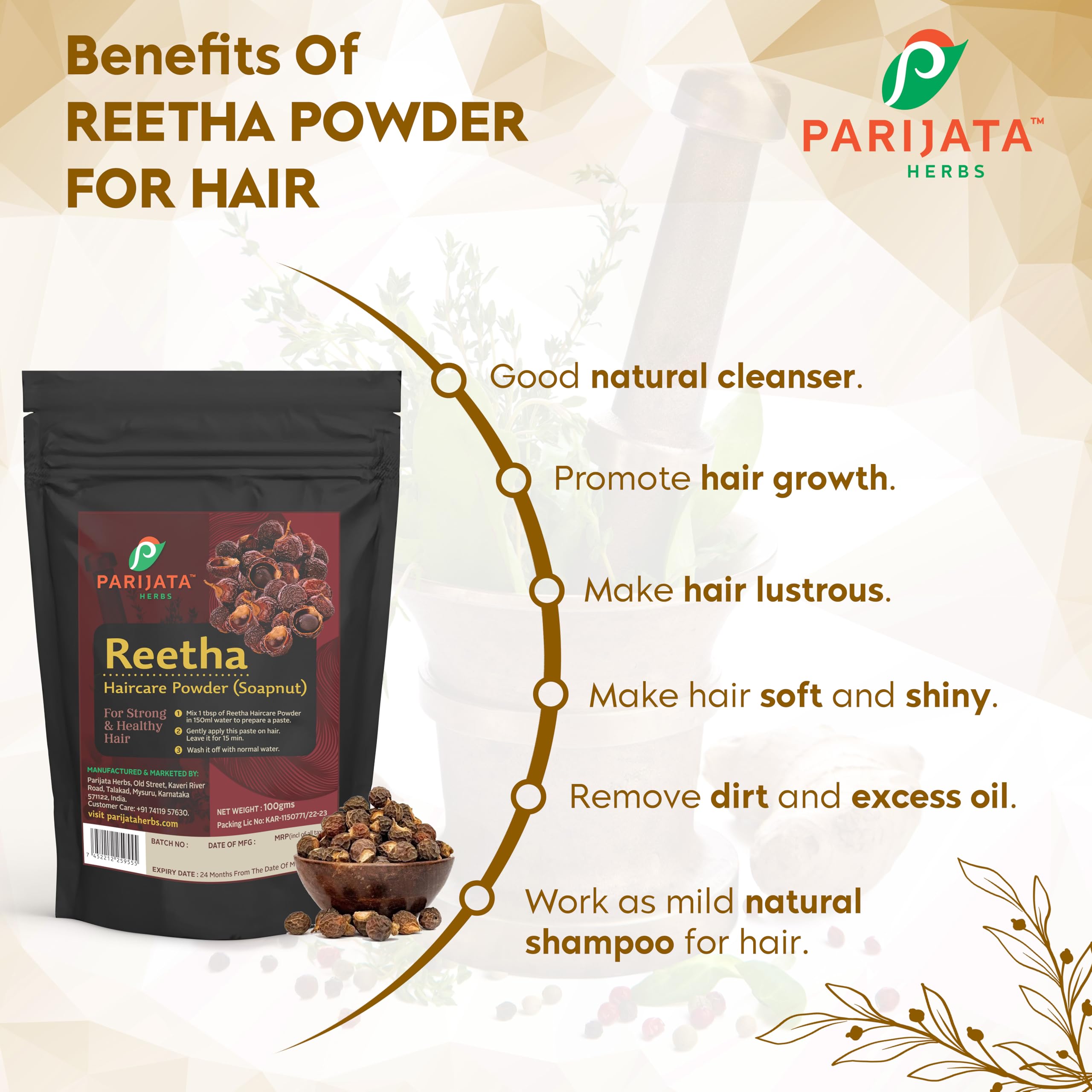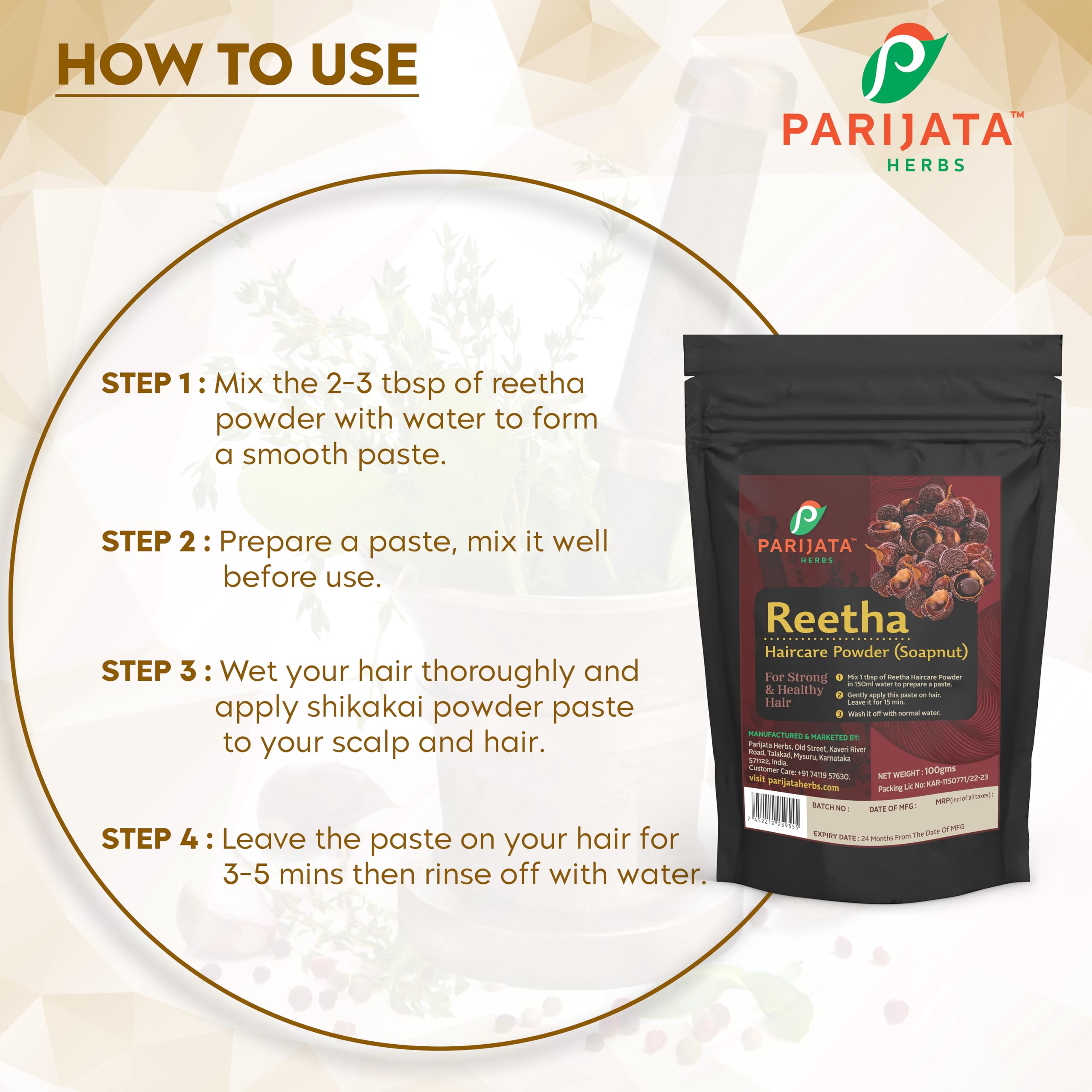 Discover the ancient wisdom of natural hair care with Parijata Herbs Reetha (Soapnut) Hair Care Powder. This 100g pack of pure natural soapnut powder has been traditionally used across generations for maintaining strong and healthy hair. The powder is incredibly simple to use - just mix with water to create a gentle cleansing paste that helps maintain your hair's natural lustre. To use combine one tablespoon of the powder with 150ml water to form a smooth paste apply it gently to your hair leave for 15 minutes and rinse thoroughly with plain water. The convenient resealable packaging ensures the powder stays fresh throughout its use. Each pack has a shelf life of 24 months from the manufacturing date giving you ample time to experience its benefits. This traditional hair care solution from Parijata Herbs brings you the goodness of natural ingredients in a convenient modern format.