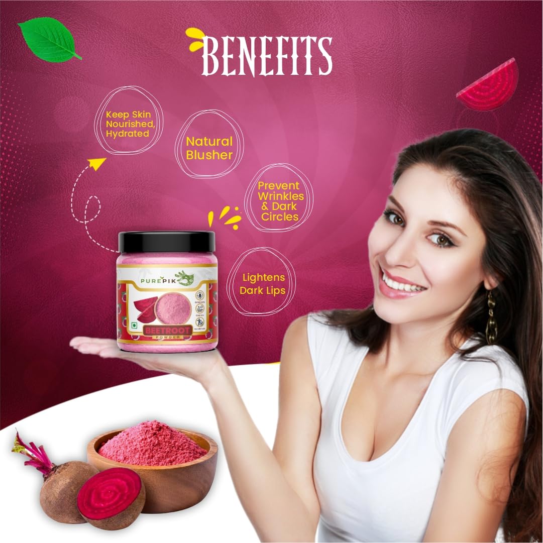 Beetroot powder can offer many beauty benefits in addition to its many health advantages. Additionally it fights free radicals in the body eliminates dead cells and aids in pigmentation removal. This substance replaces dead skin cells. As a result it contributes to bright skin. In addition you may use it to construct a variety of beetroot face packs for radiant skin.