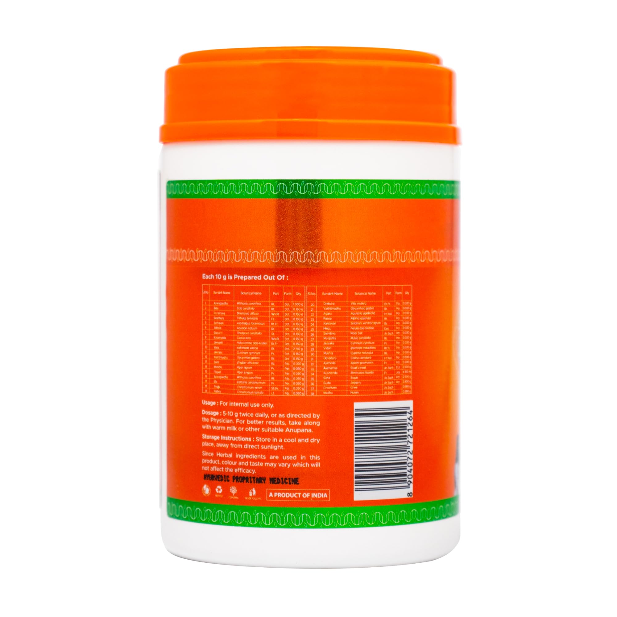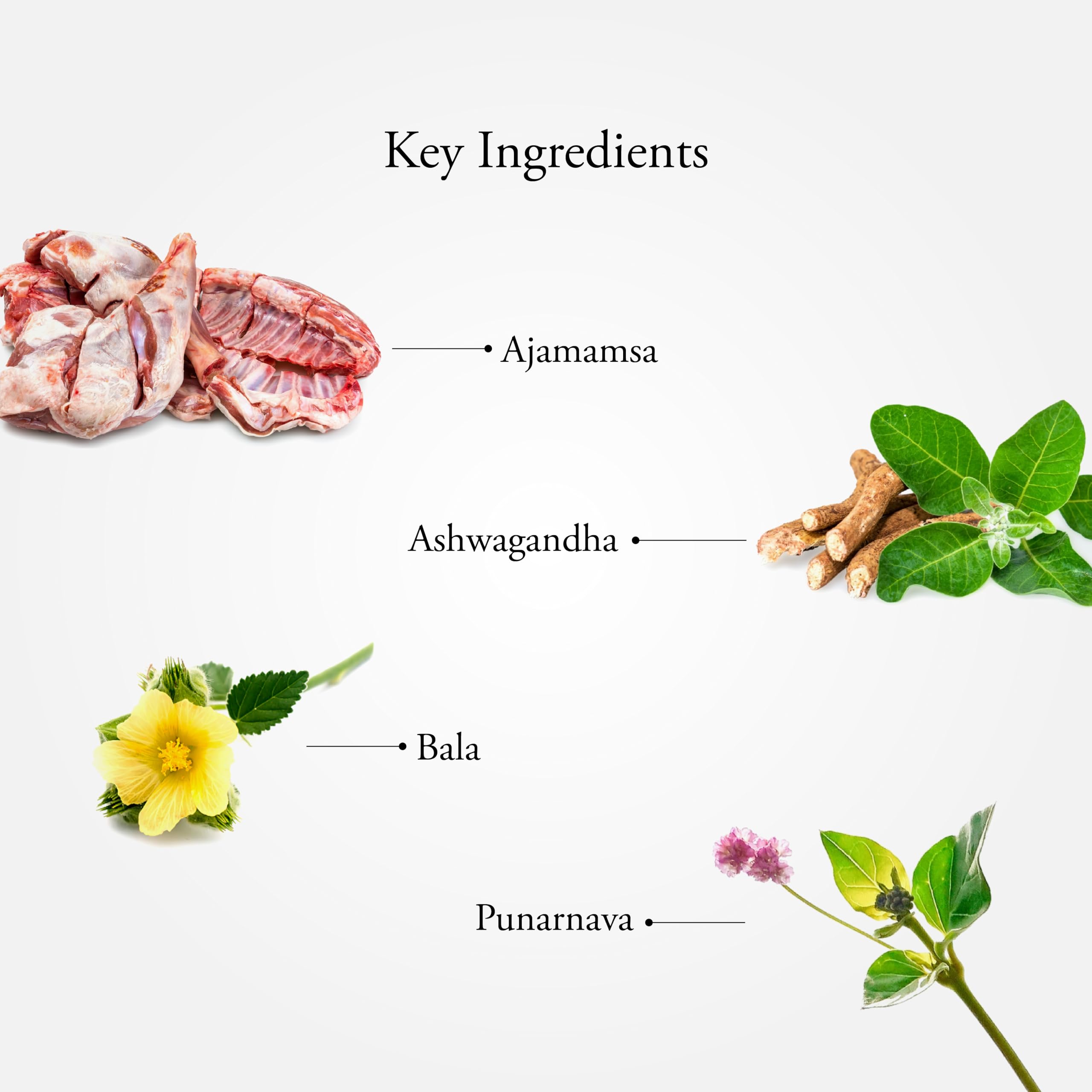 The term Rasayana in Sanskrit stands for revival. Ajaswagandha rasayana is a jaggery-based nourishing “avaleha preparation that has Aswagandha ( Withania somnifera) and Ajamamsa (Goats meat) as its key ingredients. Goats meat is hailed by classic Ayurvedic literature as the meat that is most conducive and strengthening to the human body. Avaleha preparation is a sweet and palatable adaptation of Kashaya or herbal decoction. Rich in nutrients it may be used to supplement a meal in persons with healthy . Aja Lehyam o contains fragrant spices and appetite stimulants like Cumin Cardamom Black pepper Long pepper etc.