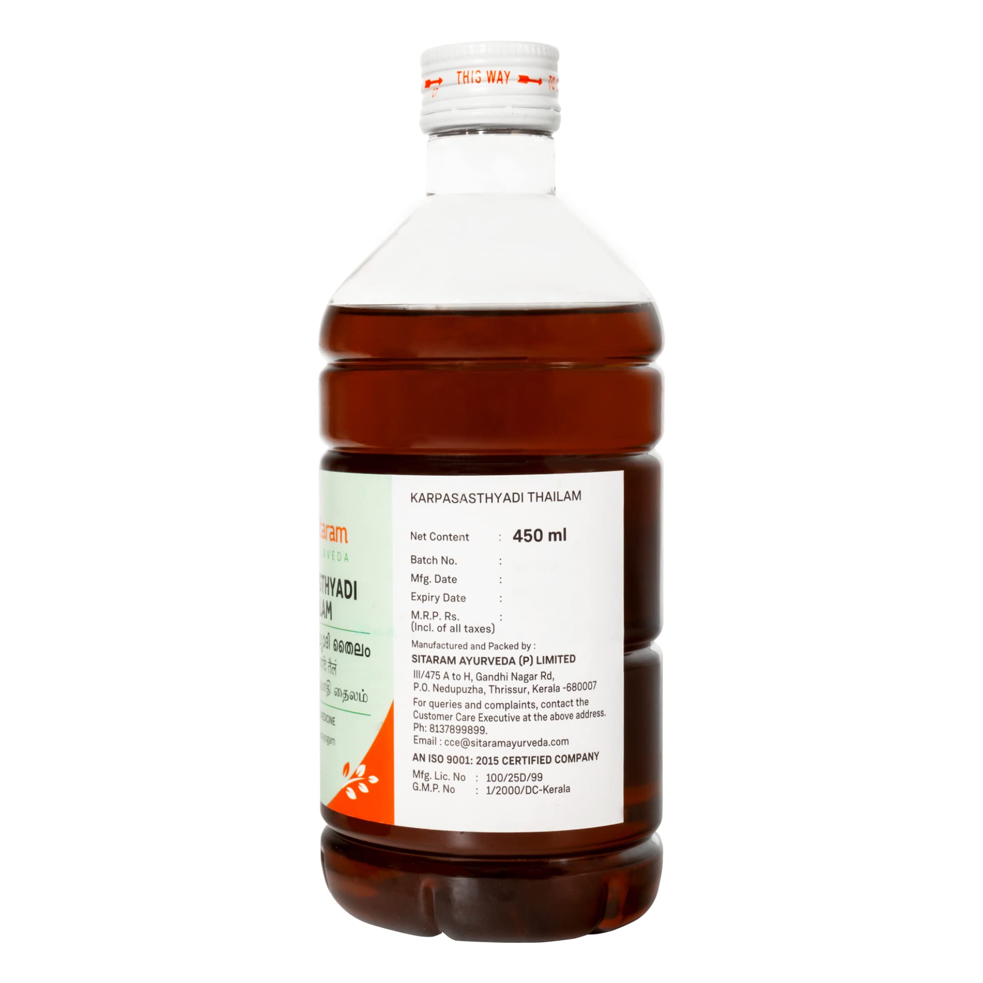 Karpasasthyadi thailam is a nourishing vata-balancing formula. It is indicated for pacifying all kinds of vata derangement in the body with a special affinity to degenerative signs in the shoulder joint. A competent osteomuscular system is the key to a functional and energetic body. Vata dosha is aggravated by a number of factors like faulty diet lifestyle climatic conditions or simply ageing. This vata-derangement manifests as dryness roughness degeneration pain in the body especially the spine and joints. Regular abhyanga with vata alleviating taila keeps these symptoms in check. It calms the body and invigorates the senses. Sesame oil fortified with the nourishing and vata-balancing properties of Karpasasthi (Seed of Gossypium hirsuitum) Bala (Sida cordifolia) Masha (Vigna mungo) Kulattha (Macrotyloma uniflorum) Devadaru (Cedrus deodara) Rasna (Alpinia galanja) Kushta (Saussurea costus) Shatahwa (Anethum sowa) Sigru (Moringa oleifera) Punarnava (Boerrhavia diffusa) etc.