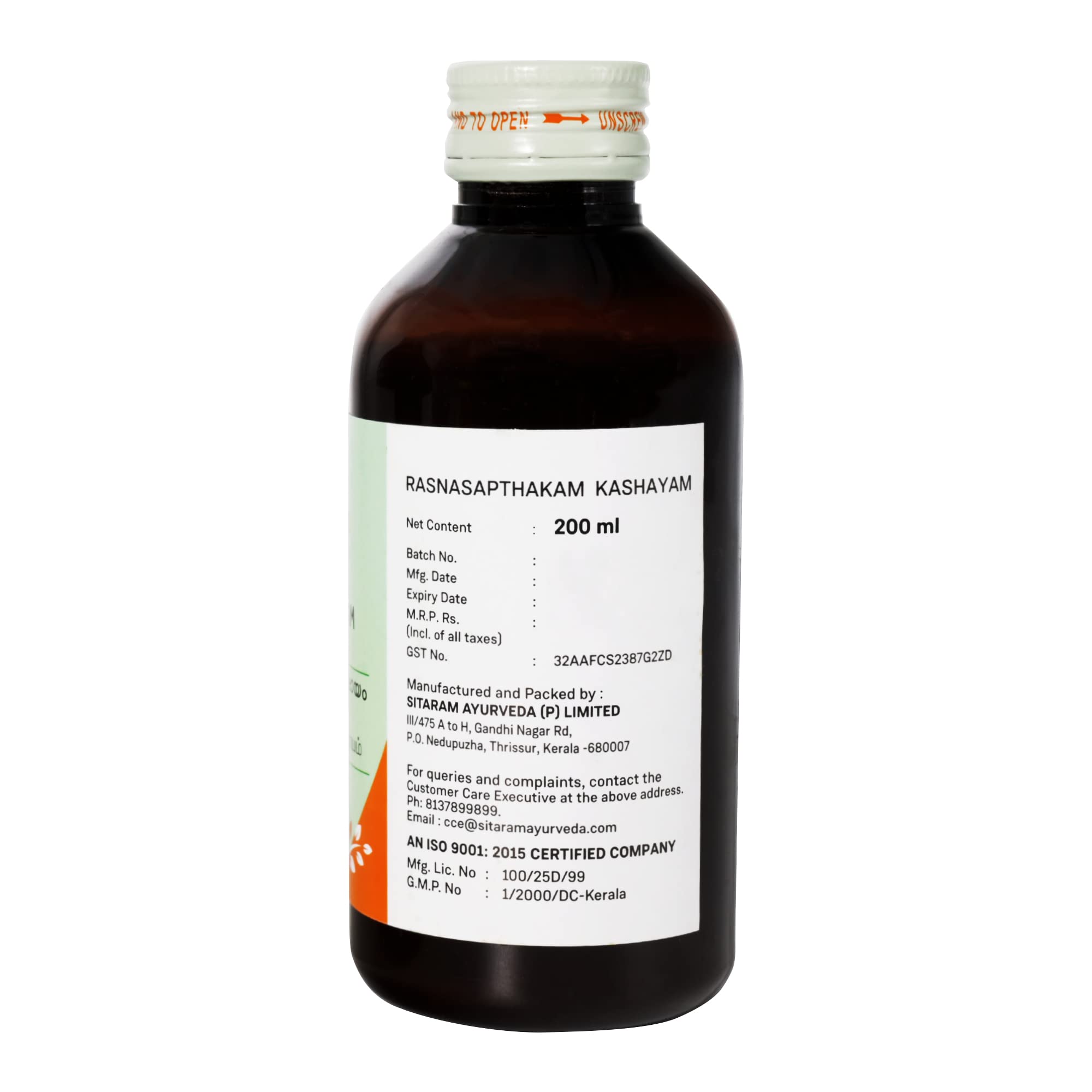 Rasnasaptakam Kashayam is an anti-combination of seven herbs widely used in managing degenerative ailments of bones and joints etc. The drug Rasna (Pluchea lanceolata) signifies the vata-hara action of the formula. Rasnasaptakam Kashayam or herbal decoctions harness the healing properties of herbs and roots in a mild and easily absorbable water base.
