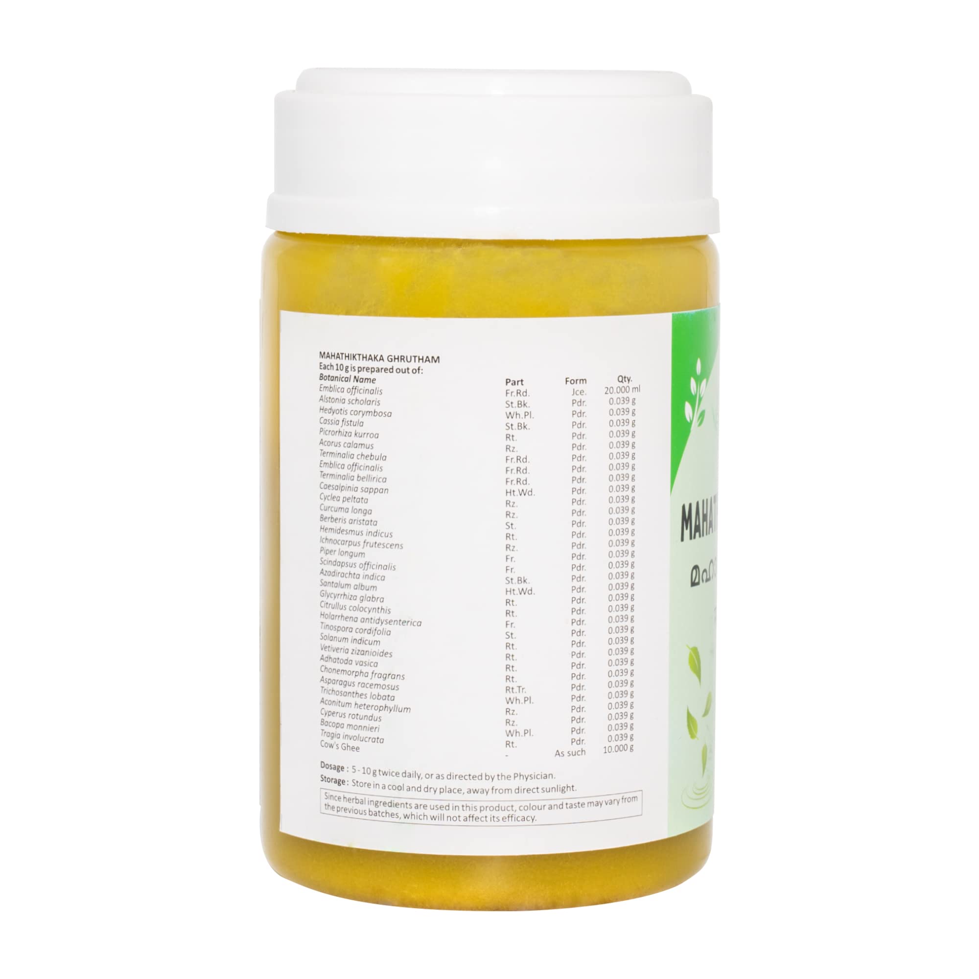 Ayurvedic materia medica lists groups of herbs based on their rasa or taste. Drugs dominant in Tikta rasa or taste act upon deranged pitta and digest it. This maybe understood as the resolution of changes in the as well as skin bones joints and supporting tissue. Mahatiktaka ghrita is a balancing combination of pitta-samana drugs in a nourishing ghee base. Ghrtaor medicated ghee harnesses the healing properties of herbs and roots in a nourishing base. Ayurveda attributes sookshma property to ghrita i.e. It is capable of reaching deep into tissues and hefrom within. It is perfectly suitable for long-term use in sustaining the effects in a body and preventing relapse.