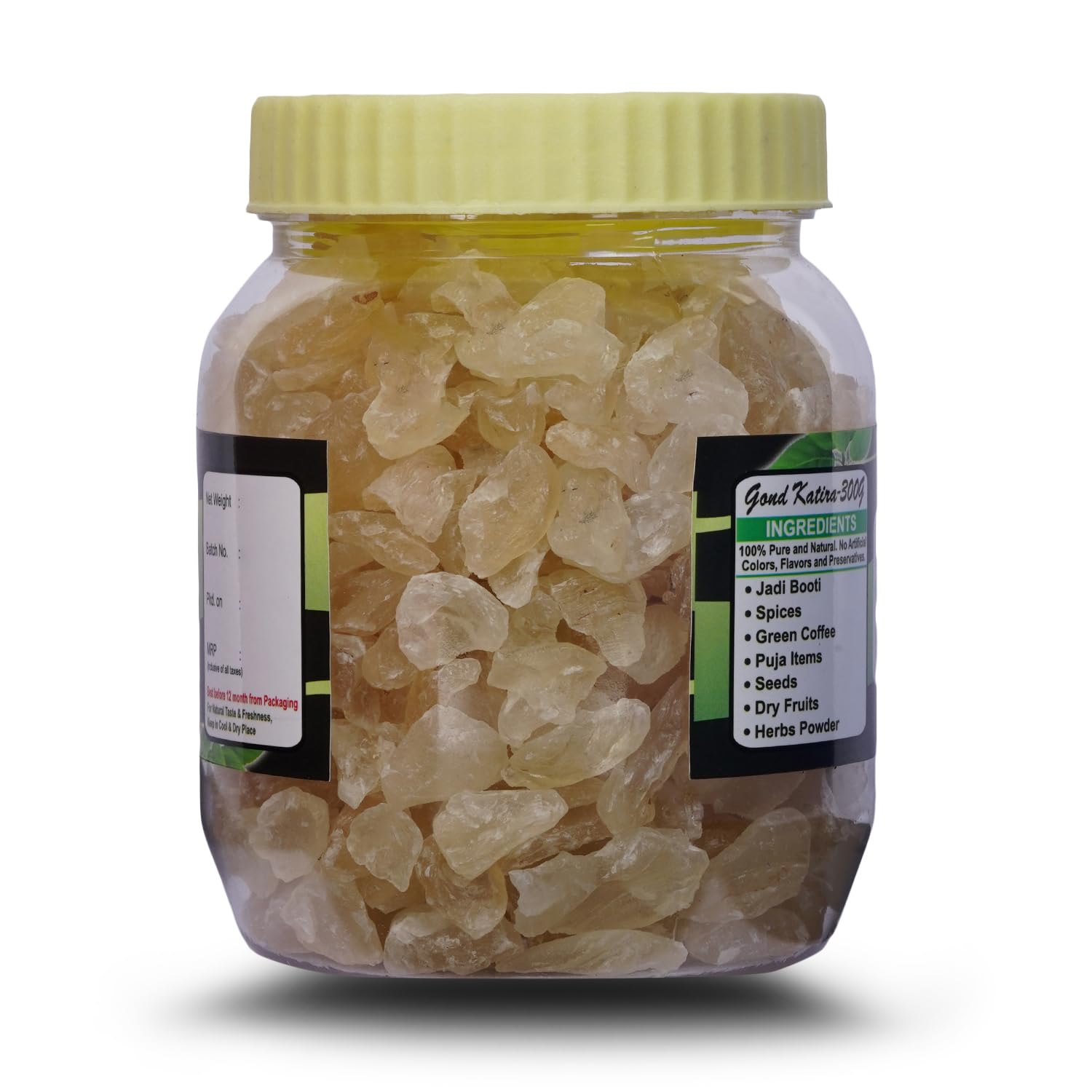 Package Content: Gond Katira Edible Gum Available Net Weight: 150gm 300gm 600gm.This is a Vegetarian product.