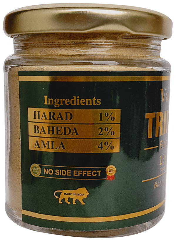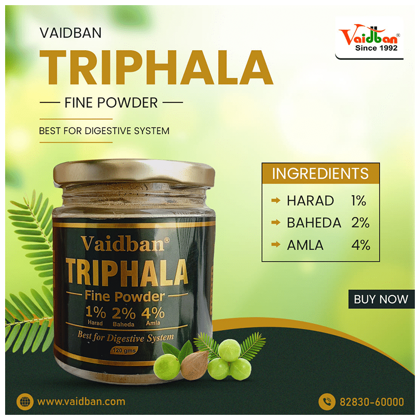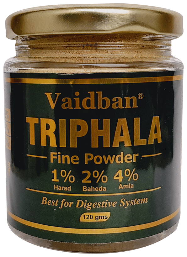 Vaidban Triphala Fine Powder contains a combination of three well-known herbs amla, harad, and bahera. These three fruits help the bowel's smooth functioning and relieve constipation.