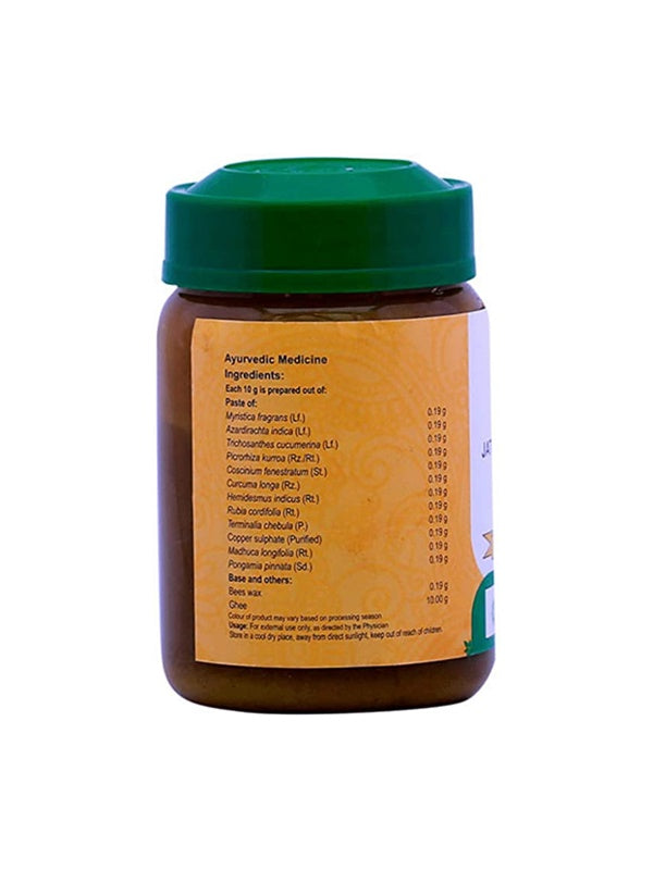 Vaidyaratnam Jathyadi Ghrutham, Herbal Ointment, For Deep Wounds: 150 gmVaidyaratnam Jathyadi Ghrutham is an Ayurvedic formulation. This herbal ointment may be useful in wounds caused by trauma or accidents.Type: OintmentForm: Semi-liquidIdeal for: Children and adultsGender: Both men and womenPackage content: 150gm in an airtight jarIngredientsVaidyaratnam Jathyadi Ghrutham is an all-natural ointment. This herbal supplement is made withGheeKutkiNeemHoneyTurmericMyrobalanIndian beechPointed gourdIndian barberryHoney bee waxArabian jasmineCommon madderIndian sarsaparillaPurified blue vitriolFeaturesVaidyaratnam Oushadhasala was founded in 1941. This Ayurvedic institute is known for its high-end herbal products. Vaidyaratnam follows Ashtavaidya Tradition to prepare its products. Vaidyaratnam Jathyadi GhruthamIs herbalIs made with the best quality ingredientsIs not known to have negative effect on the userComes with a long shelf life of 12 months from the date of manufactureDoseVaidyaratnam Jathyadi Ghrutham should be applied after consulting an Ayurvedic physician. Generally, the below steps are followed to use the decoction.Dip a cloth in the gheeUse the ointment twice a daySpread the cloth over the woundWash the wound with turmeric water or tamarind leaves for effective resultsTipsVaidyaratnam Jathyadi Ghrutham stays fresh and usable for long if the below steps are followed.Store at a cool and dry placeKeep in the provided airtight jarWarningOnly for external useKeep away from childrenKeep away from moistureDo not expose to direct sunlightDo not exceed the recommended doseLegal Disclaimer: Statements regarding dietary supplements have not been evaluated by the FDA and are not intended to diagnose, treat, cure, or prevent any disease or health conditionNote: The product is guaranteed to be 100%