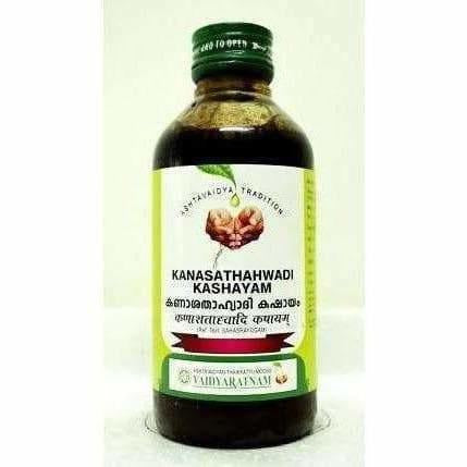 Vaidyaratnam Kanasathahwadi Kashayam, For Digestive Issues, 100% Herbal: 200 mlVaidyaratnam Kanasathahwadi Kashayam is an Ayurvedic formulation. This herbal potent is a bio safe natural product. This traditional decoction may be used for digestive disorders.Form: Liquid Ideal for: Adults Type: Herbal supplement Gender: Both men and women Package content: 200ml in a plastic, airtight bottle Ingredients Vaidyaratnam Kanasathahwadi Kashayam is enriched with herbal goodness. The decoction is made withDillGarlicSesameHorse gramGrey nickerLong pepperGlory bowerPongame oil treeHimalayan cedarBenefitsVaidyaratnam Kanasathahwadi Kashayam may be effective in several health issues likeDiarrhea FlatulenceIndigestion Stomach issuesLoss of appetite Abdominal pain Menstrual disorder in womenFeaturesVaidyaratnam Oushadhasala was founded in 1941. Since decades the company is known to manufacture herbal wellness and personal care products. At present the institute is known to prepare almost 500 classical and 150 proprietary Ayurvedic supplements.Vaidyaratnam Kanasathahwadi KashayamIs easy to useIs 100% herbal Is made with the best quality ingredientsIs not known to have any adverse effects on the user Comes with a long shelf life of 12 months from the date of manufacture DoseVaidyaratnam Kanasathahwadi Kashayam should be consumed after consulting an Ayurvedic physician. Generally the below steps are followed to have the supplement.Have the supplement twice a dayHave the herbal tonic before mealsDrink 5-15ml of the decoction per dayMix with 15-45ml lukewarm water before consumption TipsVaidyaratnam Kanasathahwadi Kashayam stays fresh and useful for long if the below tips are followed.Store at a cool and dry place WarningKeep