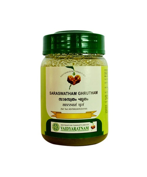 Vaidyaratnam Saraswatham Ghrutham, For Brain Development, Herbal: 150gmVaidyaratnam Saraswatham Ghrutham is an Ayurvedic formulation. This herbal ghee may be useful in neurological development in children.Form: GheeType: Herbal supplementIdeal for: Children and adultsGender: Both men and womenPackage content: 150gm in an airtight jarIngredientsVaidyaratnam Saraswatham Ghrutham is enriched with herbal goodness. Each 10gm of the herbal ghee is made withGheeGingerRock saltSweet flagMyrobalanGoats milkLong pepperBlack pepperDrumstick treeIndian moonseedBenefitsVaidyaratnam Saraswatham Ghrutham may be useful to the user in the following ways.Brain developmentBoost memory powerImprove digestive powerNeurological developmentReduce speaking difficultiesFeaturesVaidyaratnam Oushadhasala was founded in 1941. Established in Ollur, Kerala, this institute follows Ashtavaidya Tradition and Kerala Ayurveda to manufacture its products. Vaidyaratnam Saraswatham GhruthamIs herbalIs made with the best quality ingredientsIs not known to have any negative effects on the userComes with a long shelf life of 12 months from the date of manufactureDoseVaidyaratnam Saraswatham Ghrutham should be consumed after consulting an Ayurvedic physician. Generally, the below tips are followed to have the decoction.Have the decoction twice a dayTake the supplement along with lukewarm water or warm milkAdults can have 5-25 grams of the ghee per dayChildren more than 1 year of age can have 2-5 grams of the ghee per dayLight food should be consumed during the medicationTipsVaidyaratnam Saraswatham Ghrutham stays fresh and usable for long if the below tips are followed.Store at a cool and dry placeKeep in an airtight containerWarningKeep away from childrenKeep away from moistureDo not expose to direct sunlightDo not exceed the recommended doseLegal Disclaimer: Statements regarding dietary supplements have not been evaluated by the FDA and are not intended to diagnose, treat, cure, or prevent any disease or health conditionNote: The