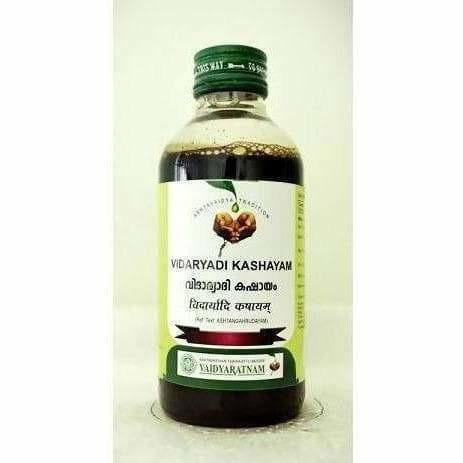 Vaidyaratnam Vidaryadi Kashayam 200 mlVaidyaratnam Vidaryadi Kashayam is an Ayurvedic formulation. This decoction is traditionally used for urinary infections.Form: LiquidType: Herbal supplementIdeal for: Adults and childrenGender: Both men and womenPackage content: 200ml in an airtight bottleIngredientsVaidyaratnam Vidaryadi Kashayam is an all-natural herbal decoction. The supplement is made withGurmarJeevakahShatavariBlue wissPunarnavaCastor beanVelvet beanGiant potatoIndian kudzuCommon beanHimalayan cedarHolostemma creeperFeaturesVaidyaratnam Oushadhasala was founded in 1941. This Ayurvedic institute was located at Ollur, Kerala. The brand follows Kerala Ayurveda and Ashtavaidya tradition to manufacture its products. Vaidyaratnam Vidaryadi KashayamIs easy to useIs 100% herbalIs made with the best quality ingredientsIs not known to have negative effects on the userComes with a long shelf life of 12 months from the date of manufactureDoseVaidyaratnam Vidaryadi Kashayam should be consumed after consulting an Ayurvedic physician. Generally, the below steps are followed to have the decoction.Take 1-2 tablespoon of the tonic per dayMix with an equal amount of lukewarm water before consumptionTake the decoction frequently throughout the day for effective resultsTipsVaidyaratnam Vidaryadi Kashayam stays fresh and usable for long if the below tips are followed.Shake well before useStore at a cool and dry placeWarningKeep away from childrenDo not expose to direct sunlightDo not exceed the recommended doseColor of the product may vary depending on the processing seasonNote: May contain additional ingredients. The product description is for information purpose only and it is always better to consume/use p