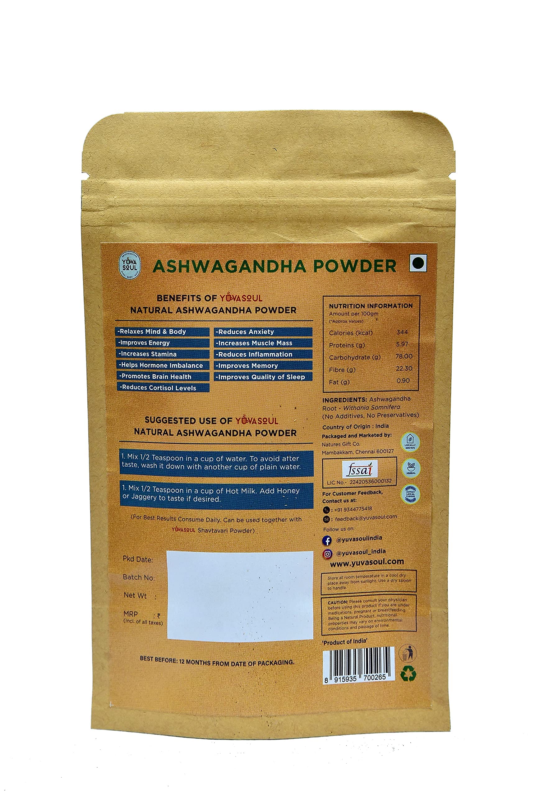 Ashwagandha powder is infused with protein carbohydrates fibre calcium and vitamin c. It possesses potent antioxidant properties as well.