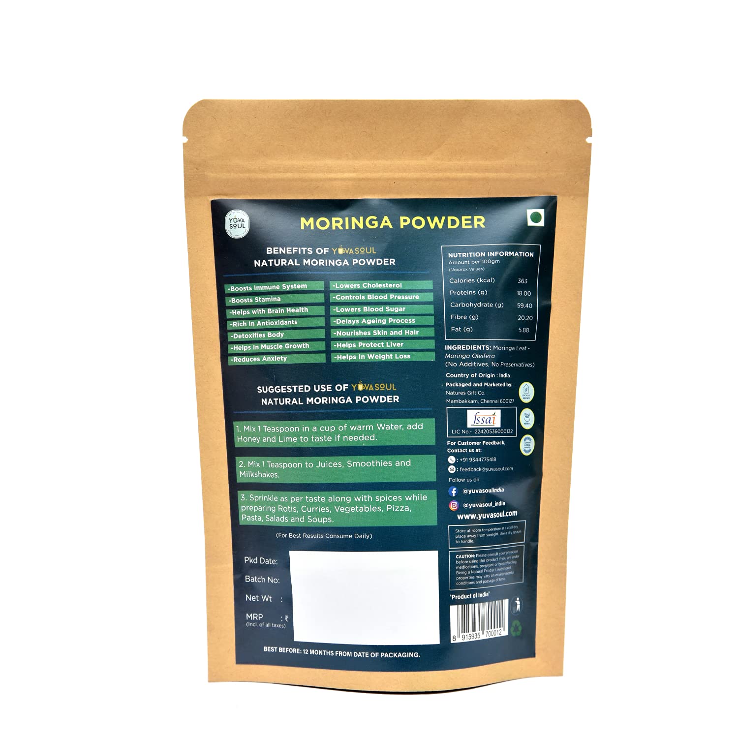 Produced from fresh leaves of the Moringa Oleifera tree also known as the Drumstick tree the Moringa leaf powder by Yuva Soul has a high nutritional profile and enriches wellbeing through its various health benefits. Loaded with Antioxidants the drumstick powder is rich in protein content..
