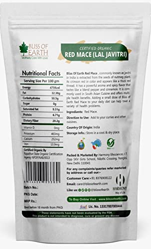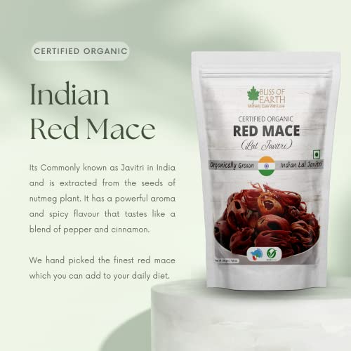 Bliss of Earth Red Mace commonly known as javitri in indian is extracted from the seeds of nutmeg plant. its crimson red in color and appears like a thick red thread. It has a powerful aroma and spicy flavor that tastes like a blend pepper and cinnamon. It is commonly used in south Asian Cuisine and offers multiple health benefits. Adding a small dose of Bliss of Earth Red Mace to your daily diet can help treat a variety of health problems.
