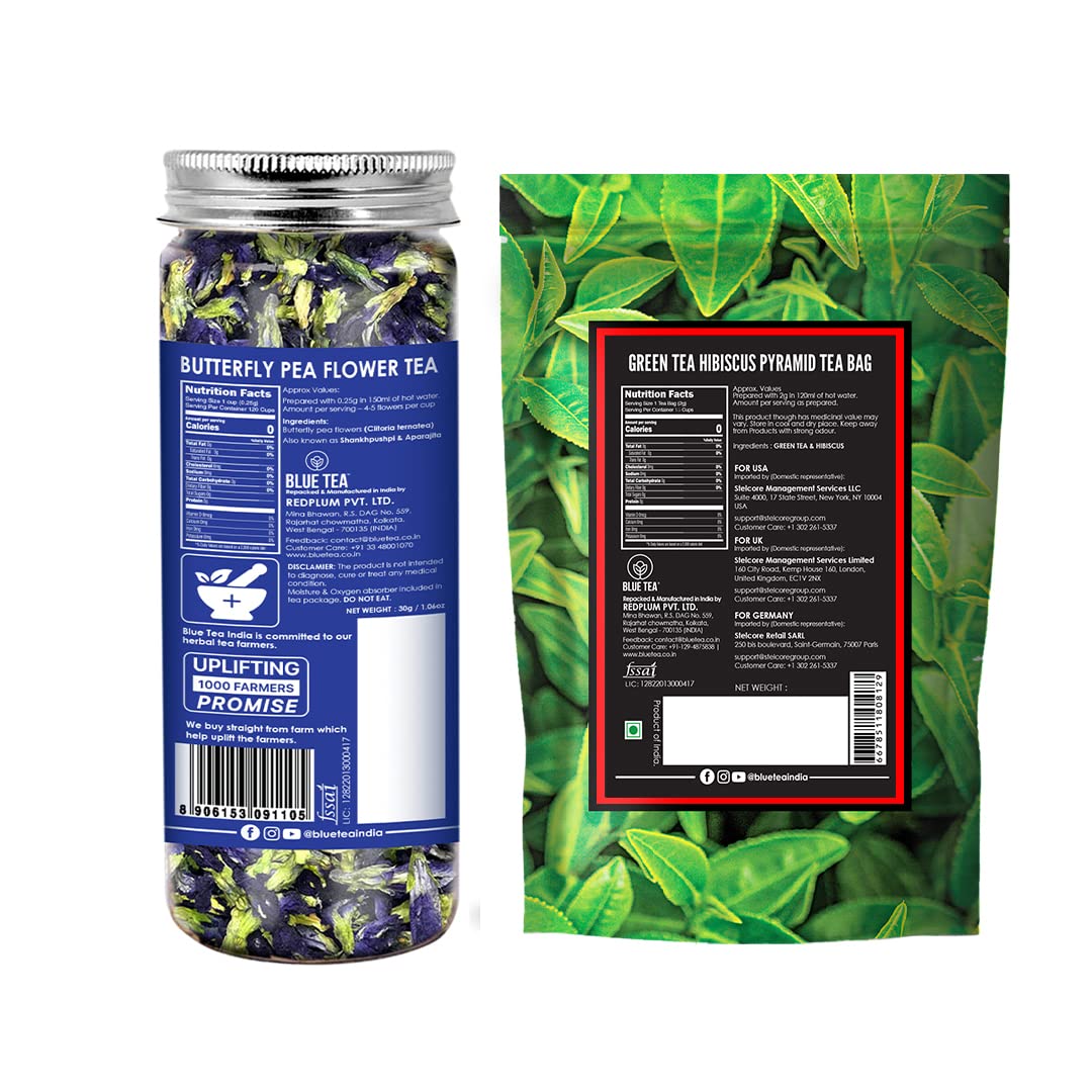 This product is a combo of Butterfly Pea Flower Tea and Hibiscus green Tea. It is a delicious treat for your health & taste. This tea can be a delightful stand-alone tea iced or hot or a nice addition to mocktails and other drinks for its fervent natural color. It is a rich source of antioxidants. These are dried in the sun on special bamboo mats to retain all-natural nutrients. It has been used for centuries for several health benefits. Bartenders from all over the world are using it in their cocktails.