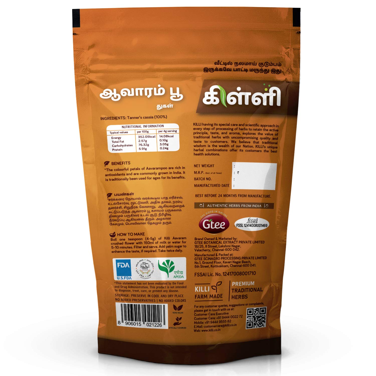 USFDA CERTIFIED - KILLI Herbs are certified by the United States Food and Drug Administration FSSAI Food Safety and Standards Authority of India HALAL India. All the herbs are grown by our farmers naturally with no added chemical fertilizers. They are cle