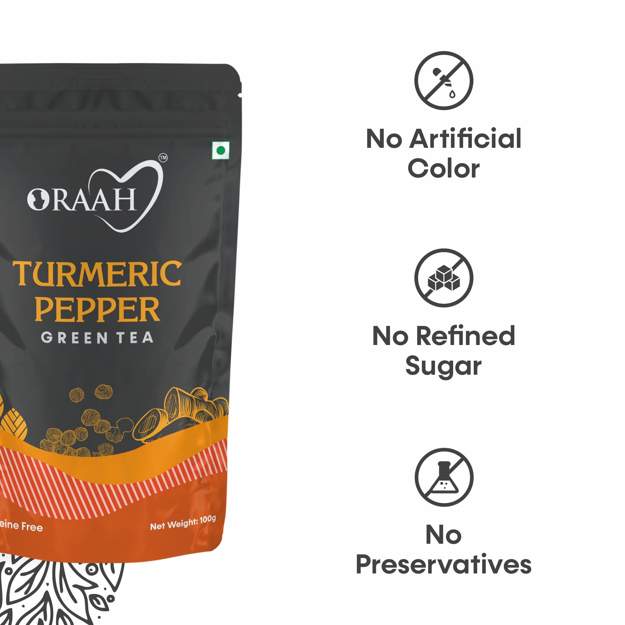 Oraah Turmeric Pepper green tea for happy gut and cleansing with Turmeric and Blackpepper. 100% Natural Ingredients. Make this part of your health by ideally drinking 2 cups a day.