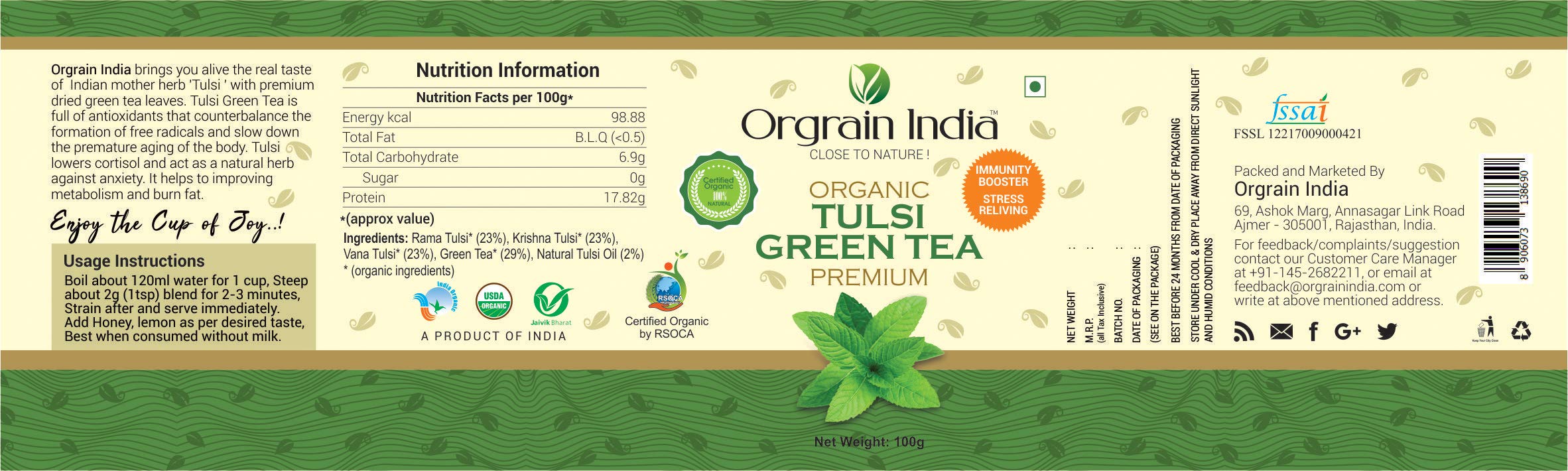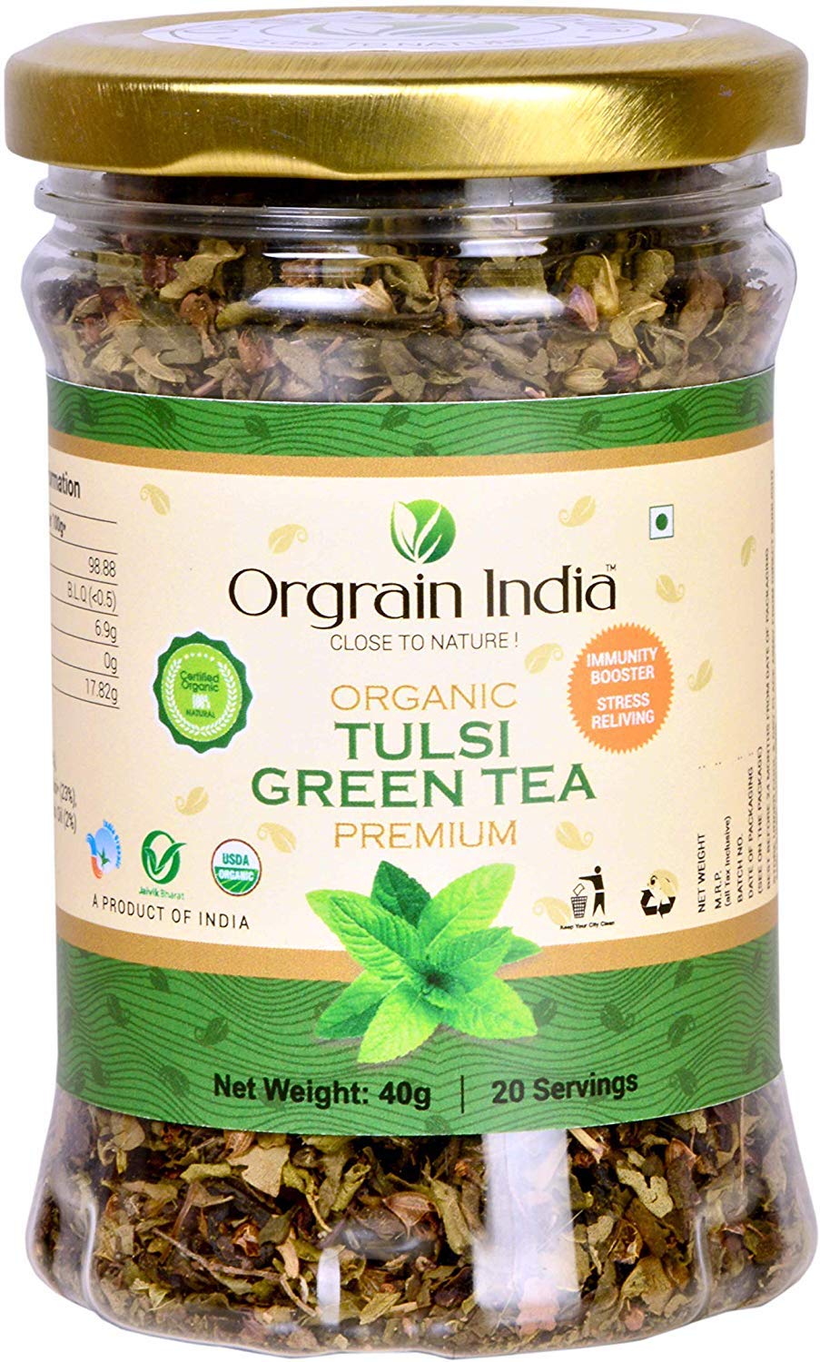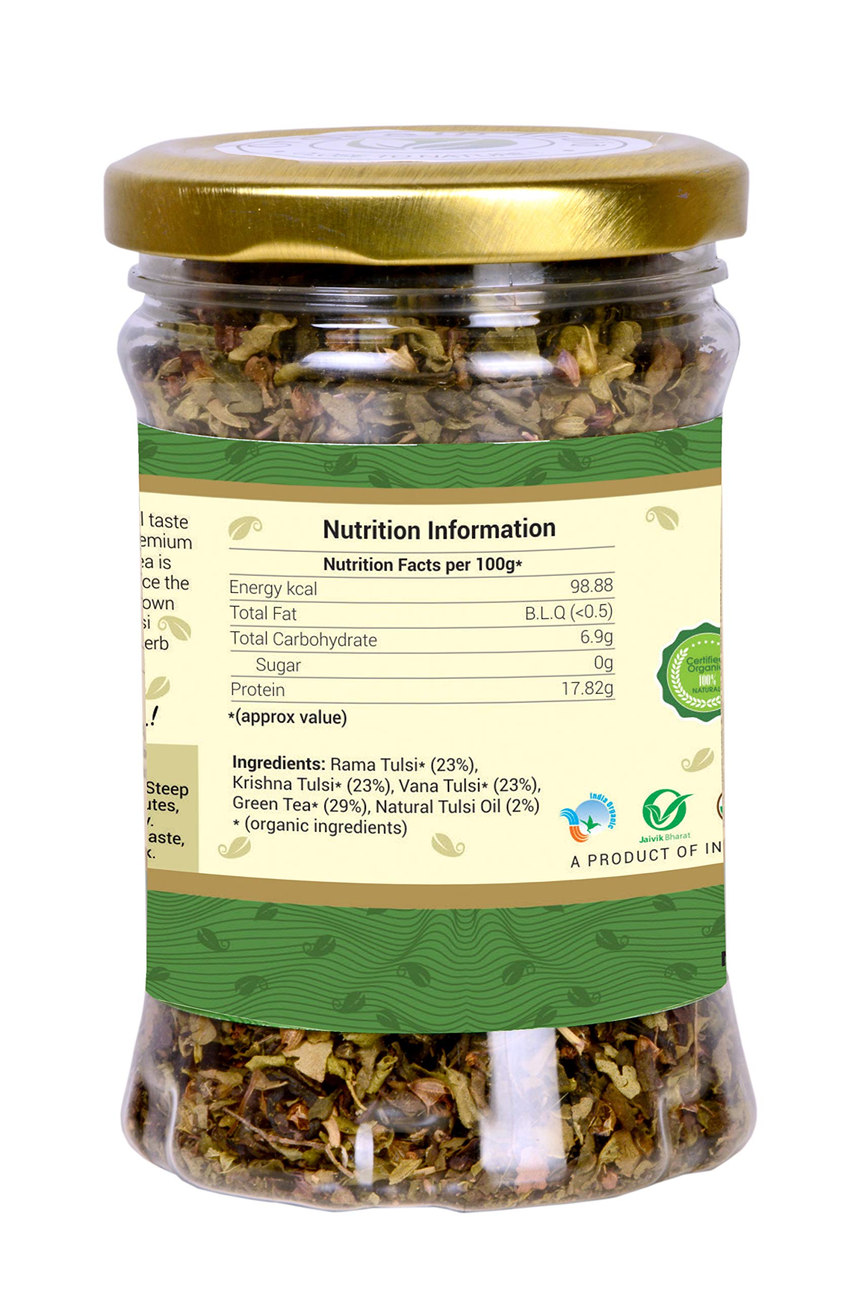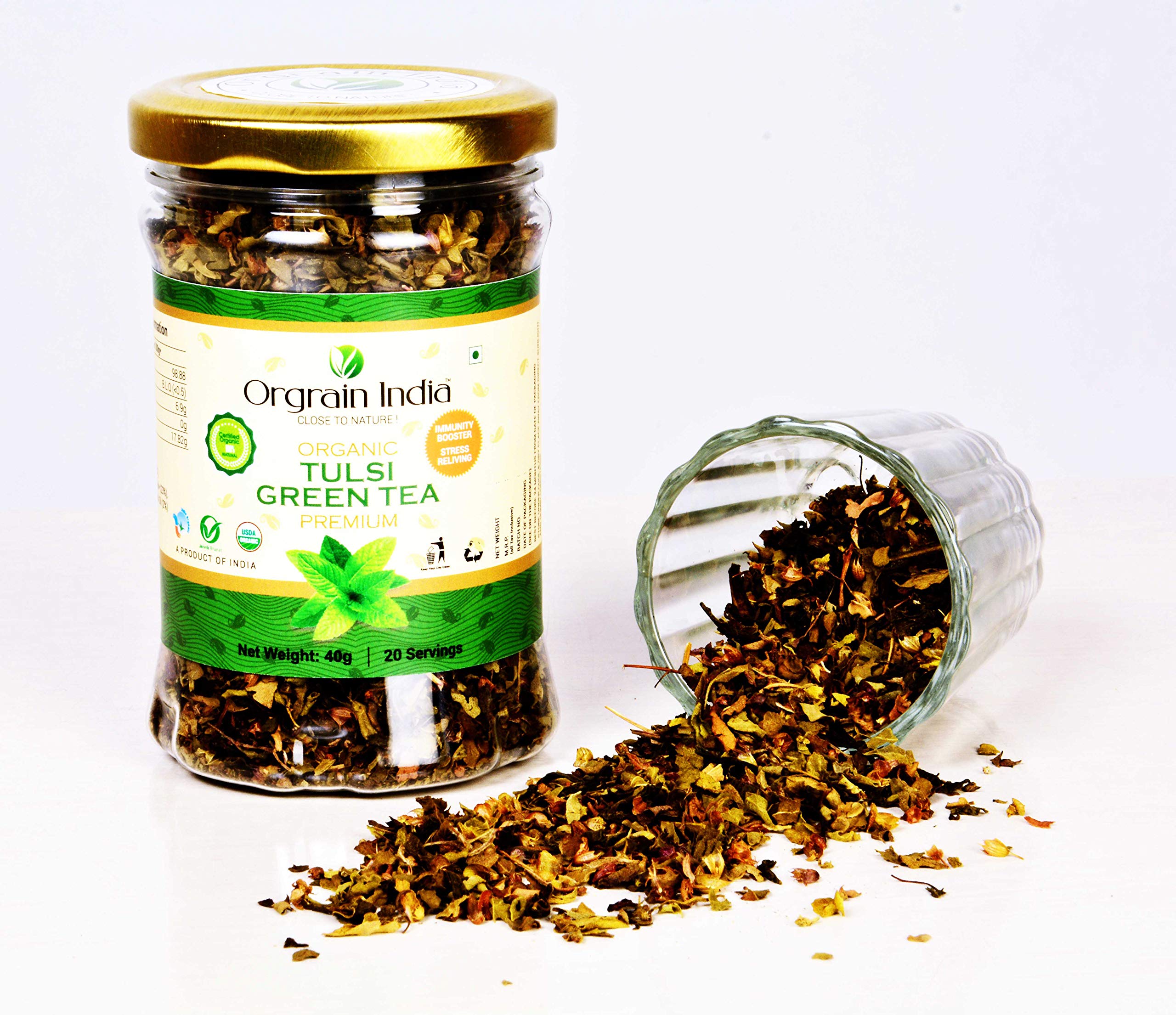 Orgrain india USDA Certified Organic 100% Pure Premium Quality Tulsi Green Tea is made form Organic Green Tea and 3 type of Organic Tulsi Leaf (Rama Vana Krishna) and 100% Natural Tulsi oil.