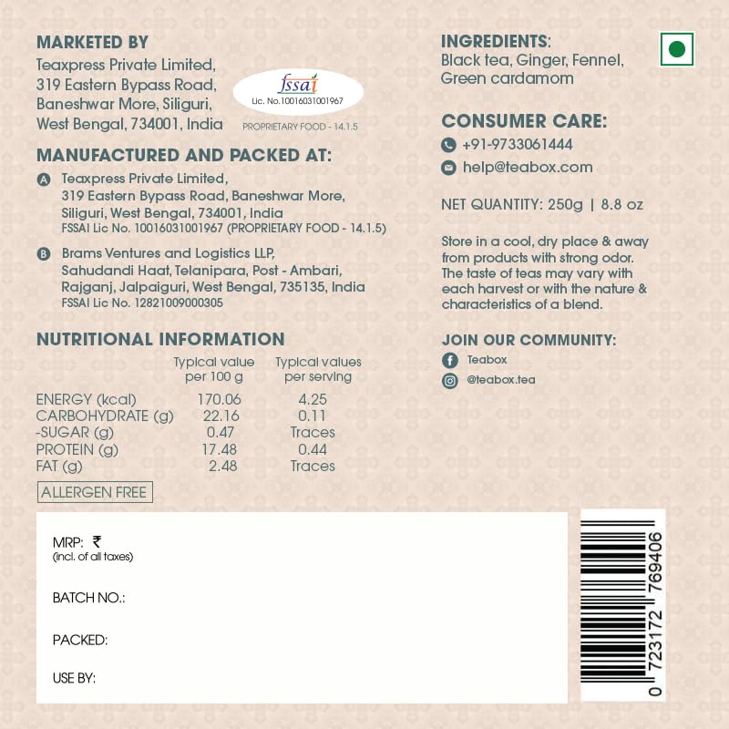 Teabox Bombay Cutting Chai | Inspired By The Bustling City | Blended With Natural Cardamom, Ginger & Fennel, 250 Grams