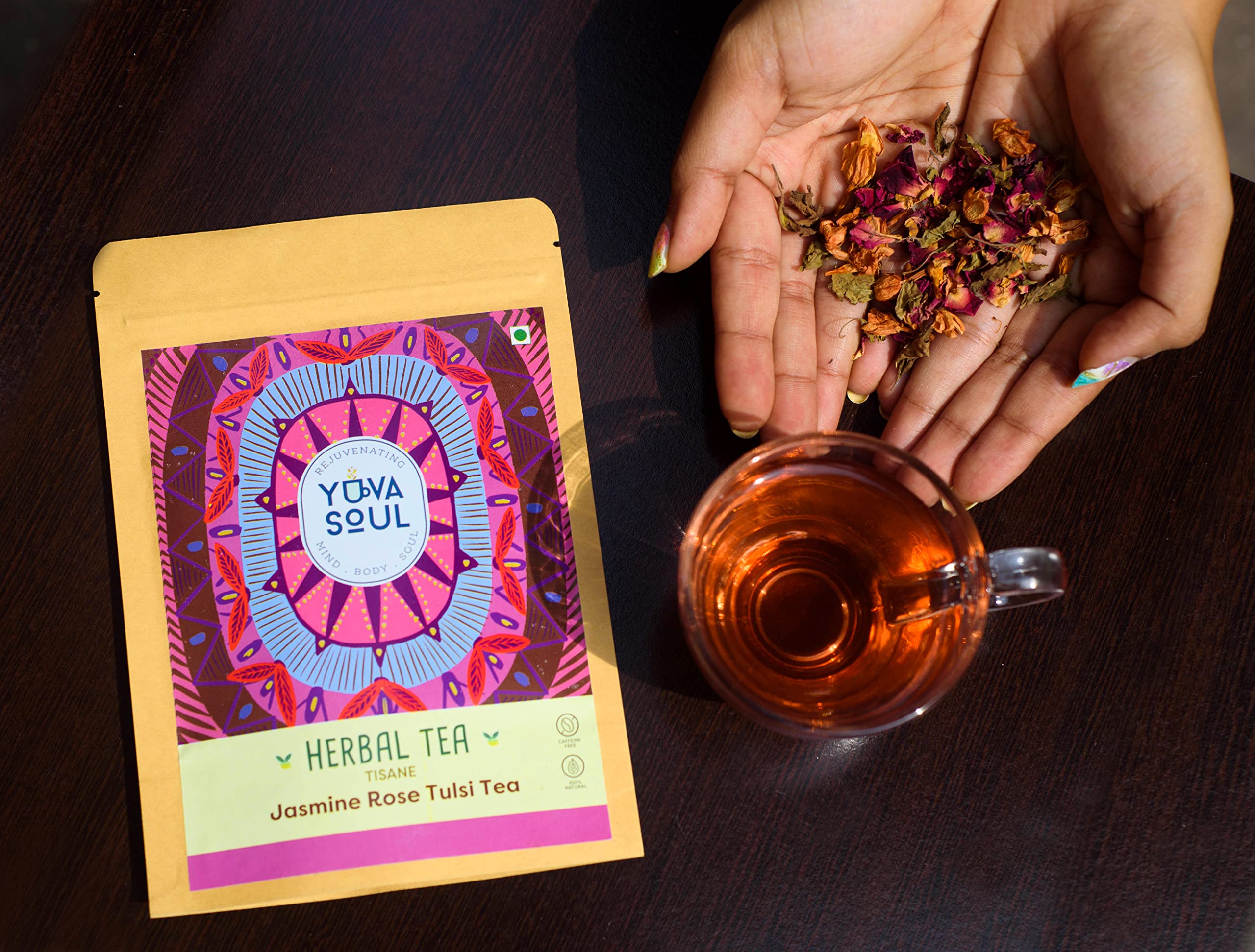 YUVA SOUL Jasmine Rose Tulsi tea is a floral based tea which not comes with an array of health benefits. Jasmine is rich in anti-oxidants which delay the signs of aging. Promotes inch loss and weight loss. Rose is herbal and is known to improve digestion system. As a healthy digestive system is important for weight loss drinking a cup or two of rose tea support weight loss. Tulsi (also known as Holy Basil) makes a delicious and refreshing tea that possesses wonderful health benefits that support the body's natural immune system while relieving the body's negative reaction to stress.