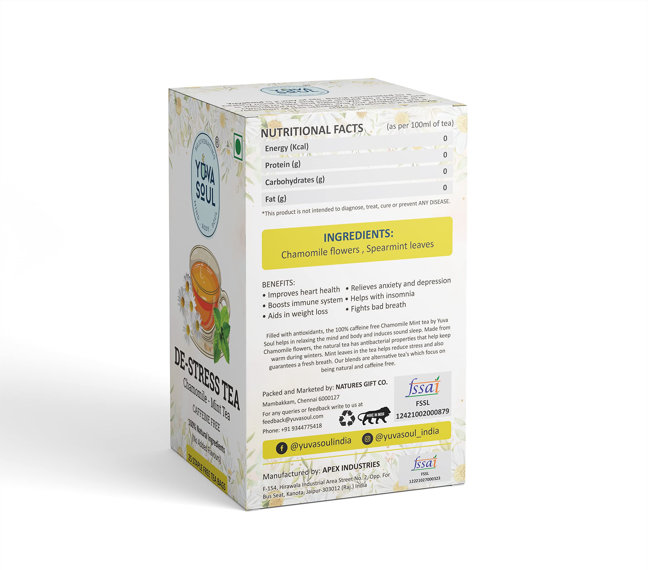 Filled with antioxidants The Yuva Soul Chamomile Tea is a great soother after a long tiring day. Chamomile Tea is Made from dried Chamomile flowers and fresh Spearmint leaves the Destress tea helps in relaxing the mind and body and induces sound sleep. This Chamomile Tea have antibacterial properties of the tea helps relieve a sore throat and reduces stress.