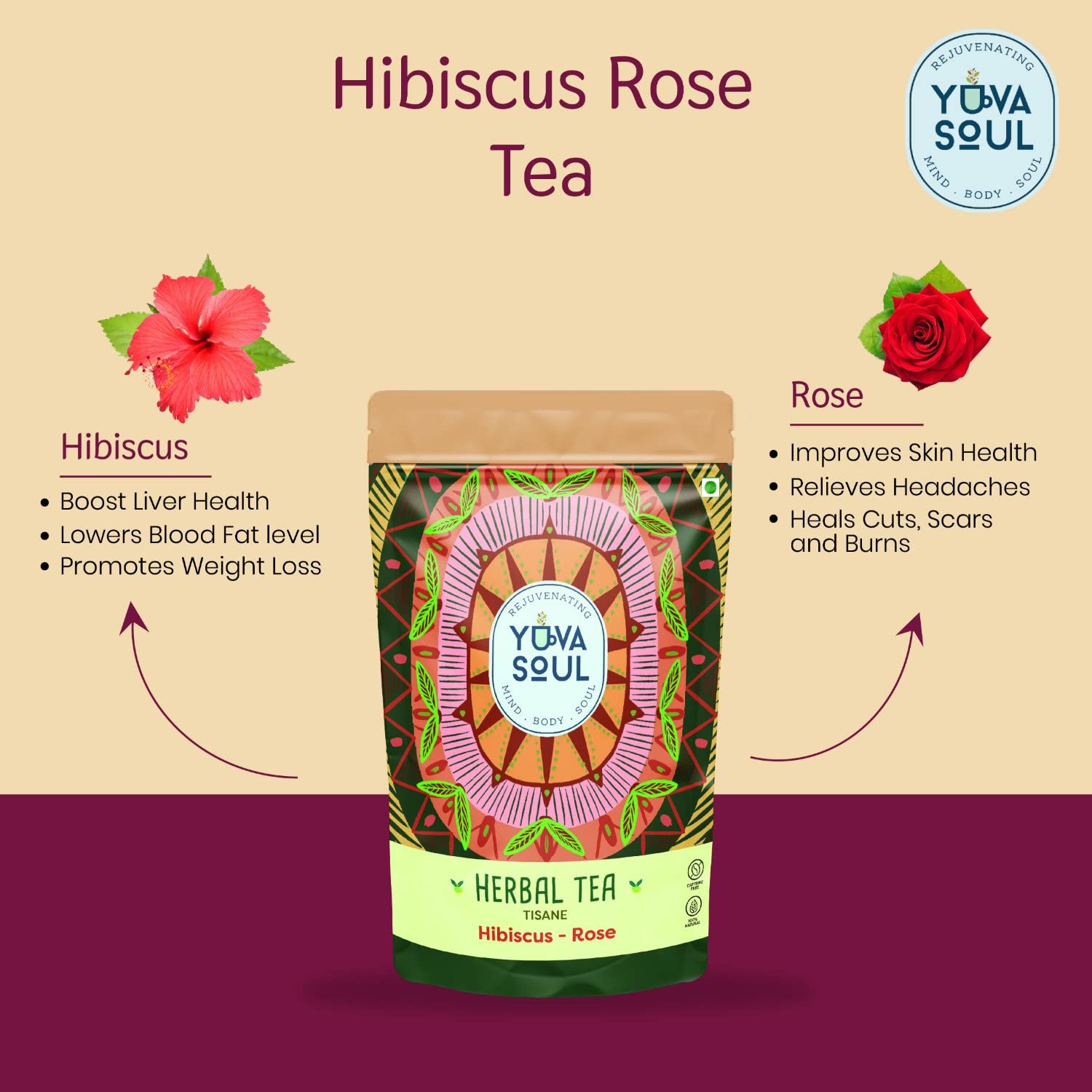 The oxidant rich Hibiscus Rose tea by Yuva Soul is a delicious infusion of dried petals of the hibiscus and the rose flower. The sweetness of the rose and tanginess of the hibiscus gives the tea a deep-red colour. This soothing combination of Rose and Hibiscus is rich in vitamin C that helps the skin detox and also boosts metabolism. Also the flavourful hibiscus-rose tea can be consumed hot or as an iced tea based on ones preference.