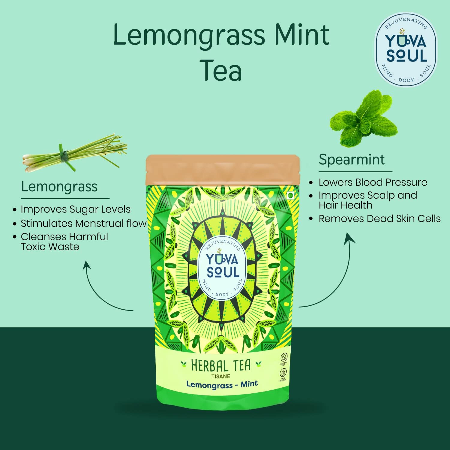 YUVA SOUL Lemongrass Tea Lemongrass Green Tea Mint TeaMint Lemongrass Tea Lemongrass Mint Tea For Immunity Booster and Weight Management Hair & Skin Pure Herb Caffeine Free Detox Tea - 75 Gm