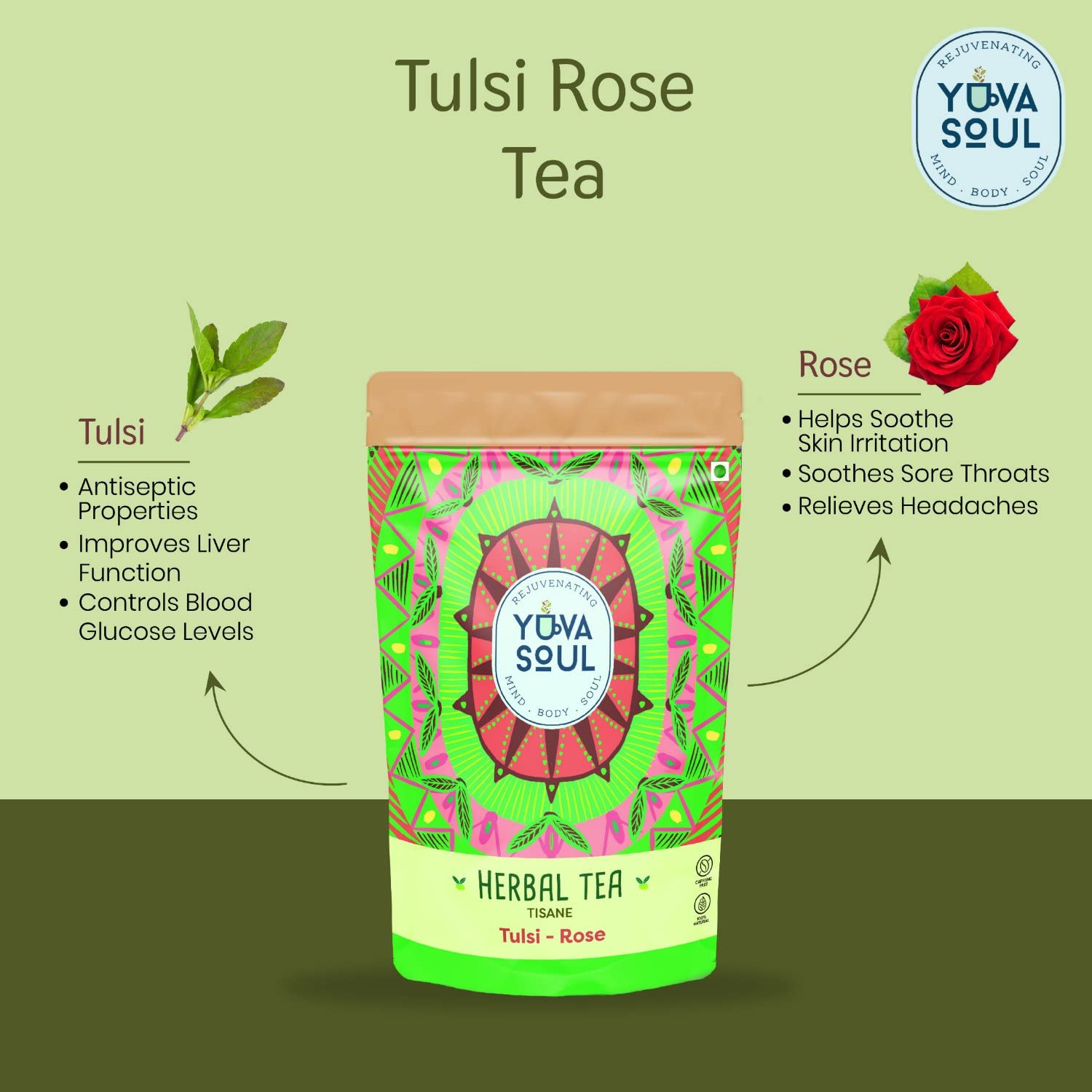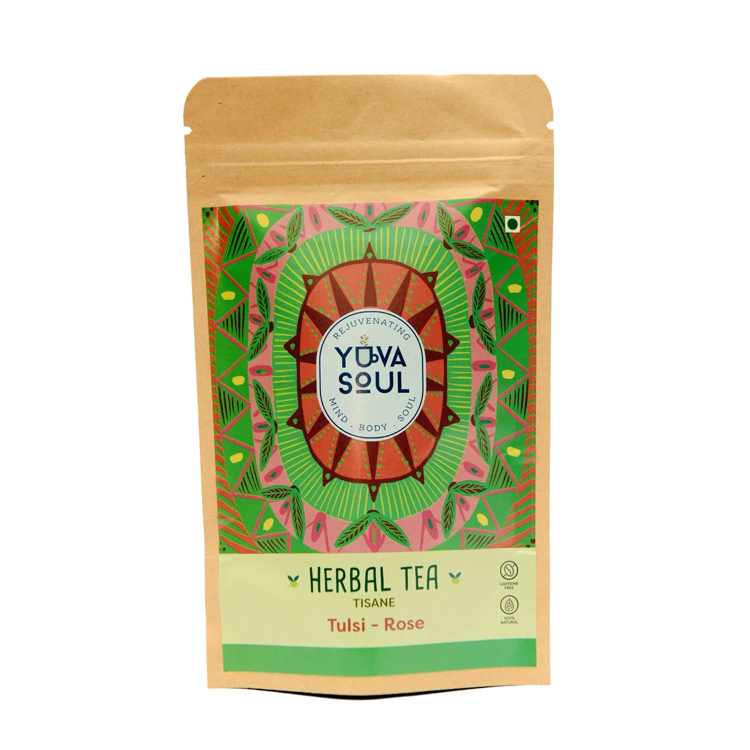 Known for its immunity boosting properties the Yuva Soul Tulsi Rose tea is rich in antioxidants and increases energy levels. Used as the prime herb since ancient ayurveda for its healing properties Tulsi leaves infuses the tea with its antibacterial properties that soothes a sore throat. Whereas the blend of rose in the tea has a calming effect on the mind and body and also results in radiant skin.