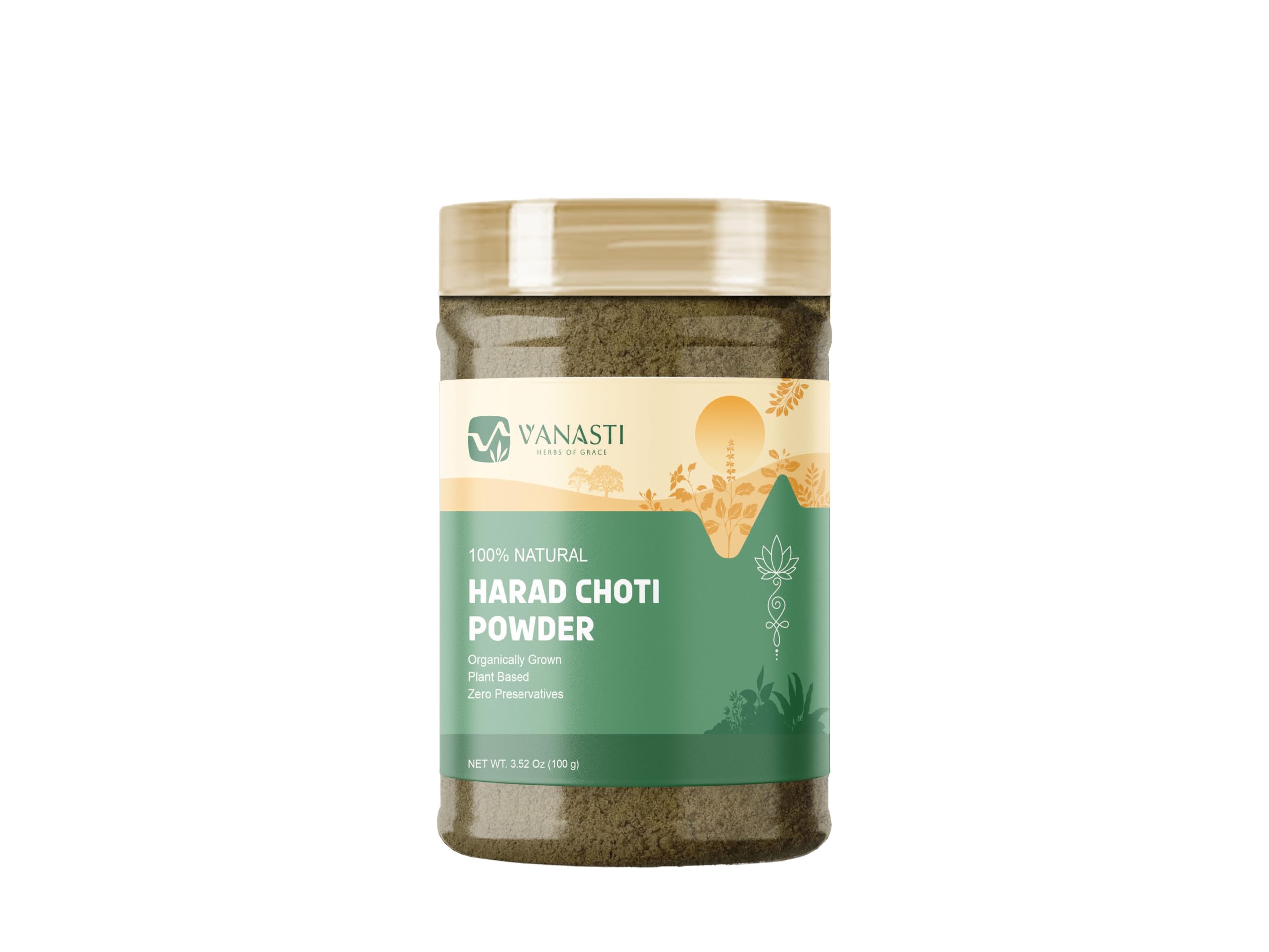 Harad Choti (also called Kali Harad or Black Himej) is the small, dried fruit of the Terminalia chebula tree, which grows in Southeast Asia. These fruits are dark brown to black in color, wrinkled in appearance, and have a slightly bitter taste. Harad Choti has been part of traditional practices for a long time and is often used in herbal powders and natural blends. It naturally contains vitamin C, iron, and plant compounds like tannins and flavonoids.
